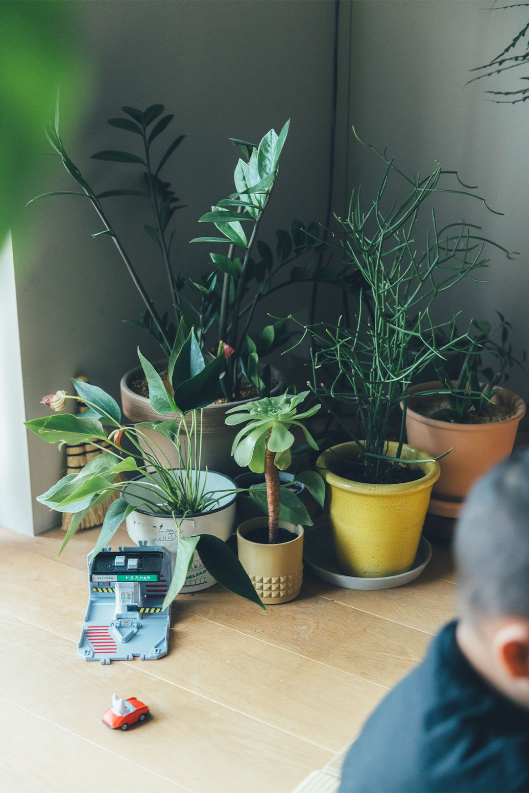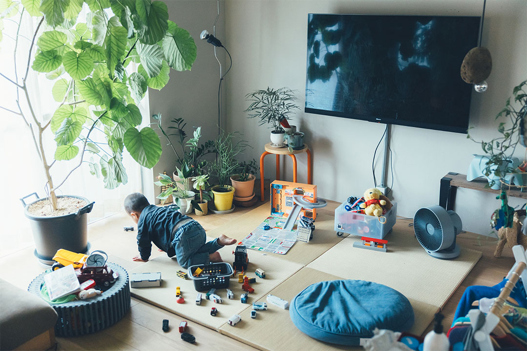テレビを壁掛けにし、極力スペースを確保したリビング兼キッズスペース。白くんが生まれてからは、クッションマット代わりに敷畳をセット。「私の実家でも使用していて馴染みがあったので、畳を選びました。子どもに使うグッズは、大きくなってからもインテリアとして活躍することを念頭に選んでいます。植物が心配だったので、ベビーサークルも検討しましたが、きちんと最初に言い聞かせたら、そのあとは触らないようになりました。でもたまに、鉢の土を掘り起 こしてミニカーのトラックに載せています(笑)」(木綿さん)
