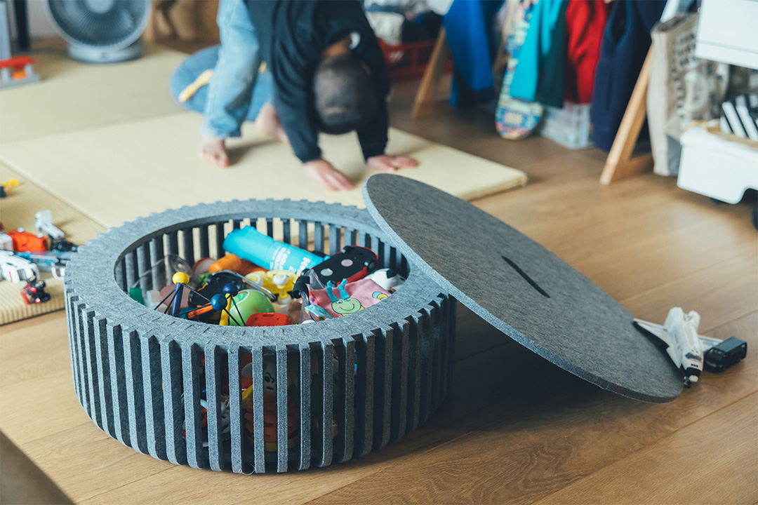大学時代の友人でプロダクトデザイナーの石垣純一さんが手掛ける〈Array Polar〉のストレージテーブルをオモチャ入れに。再生フェルトを使用しているため軽く、床を傷つける可能性も低いそう。