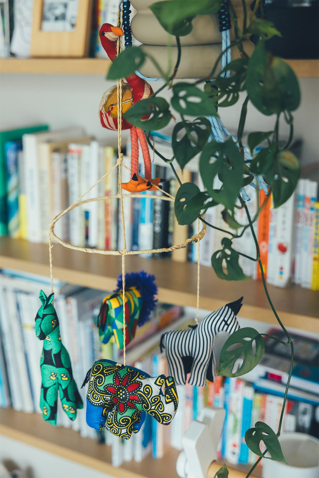 偶然お店で見つけたアフリカ雑貨のつるし飾り。「メリーではないのですが、カラフルな色使いなので、赤ちゃんの頃は息子が反応していました」(木綿さん)