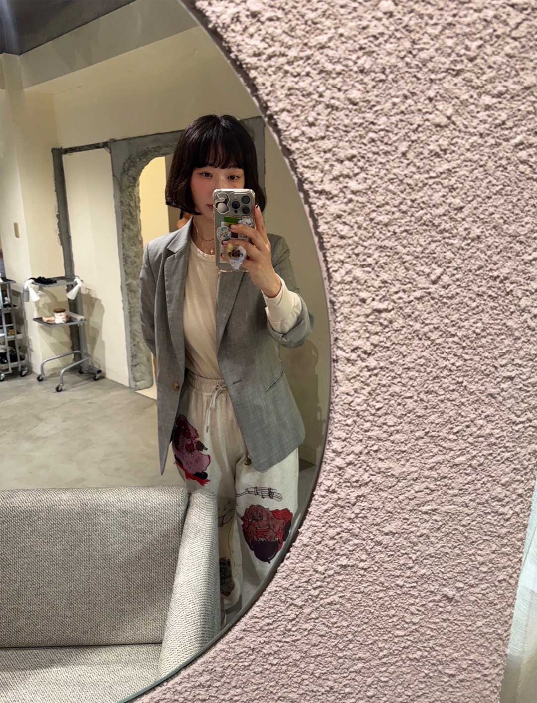 「デザイナーさんによる手描きイラストがキュートなスウェットパンツ。遊び心があり素材もスウェット地なので、お仕事シーンではカジュアルになりすぎないように、ジャケットを合わせてかっちりさせることも多いです」