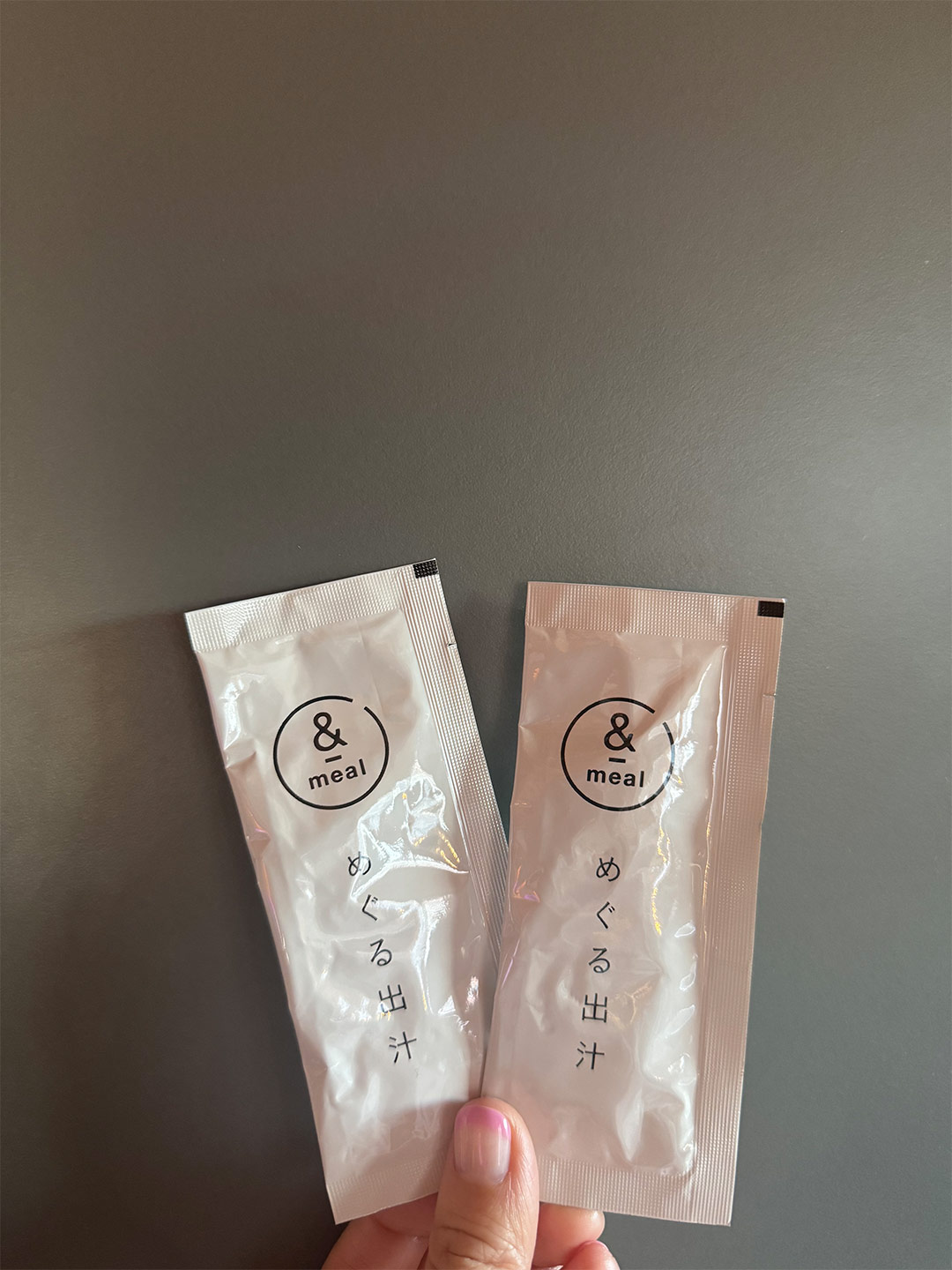 「信頼している安心素材の冷凍ミールブランド『アンドミール』による出汁。いつもは昆布と鰹節で出汁をとるのですが、温かいものをさっと飲みたい朝や、忙しくても体にいいものを取り入れたいときに。ウォーターサーバーのお湯を注ぐだけで、手軽にホッとする一杯が完成」