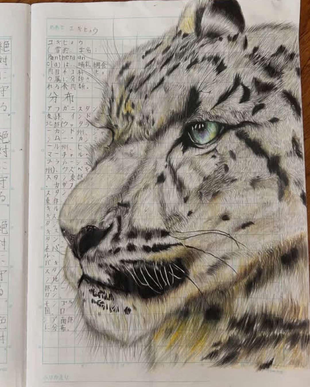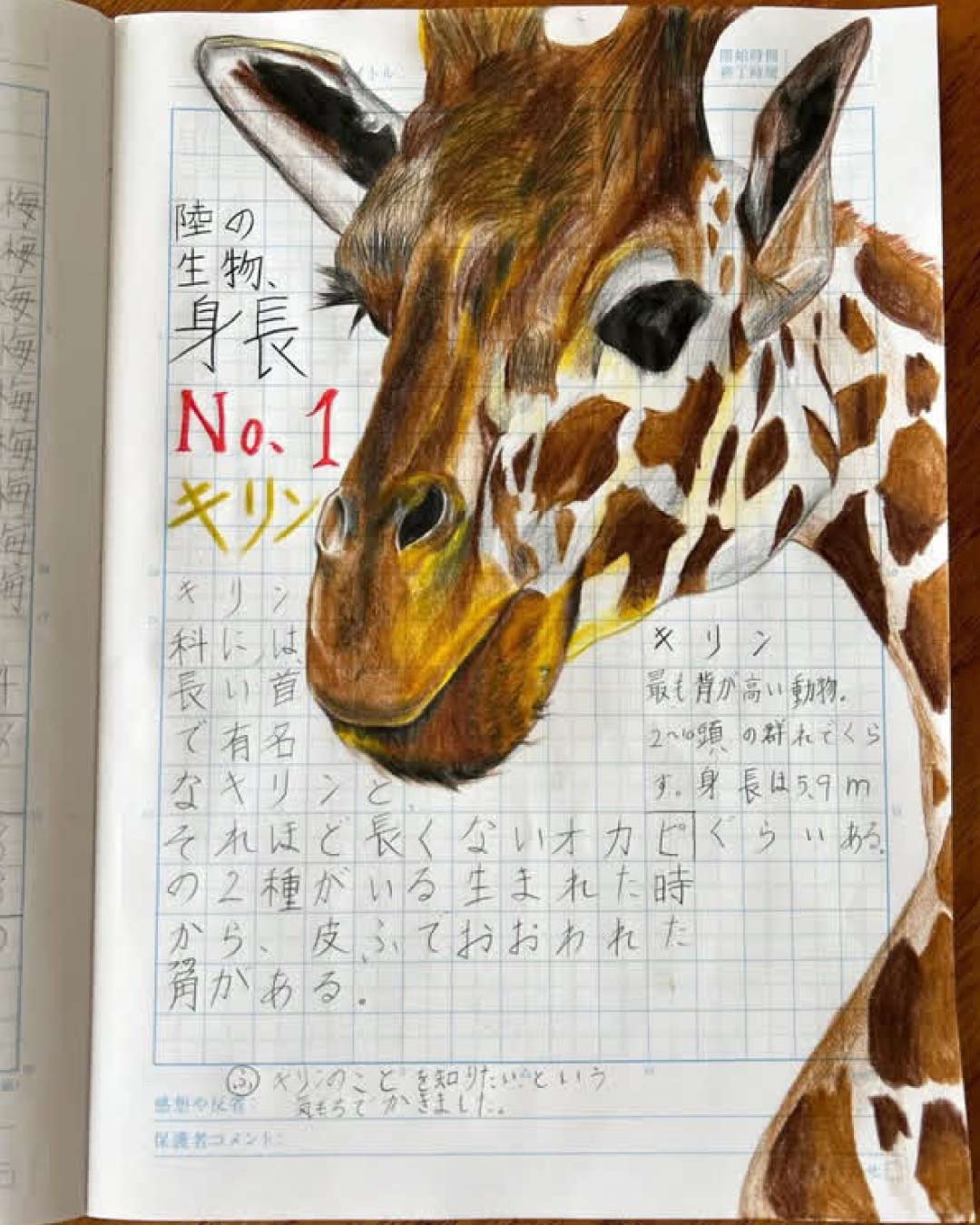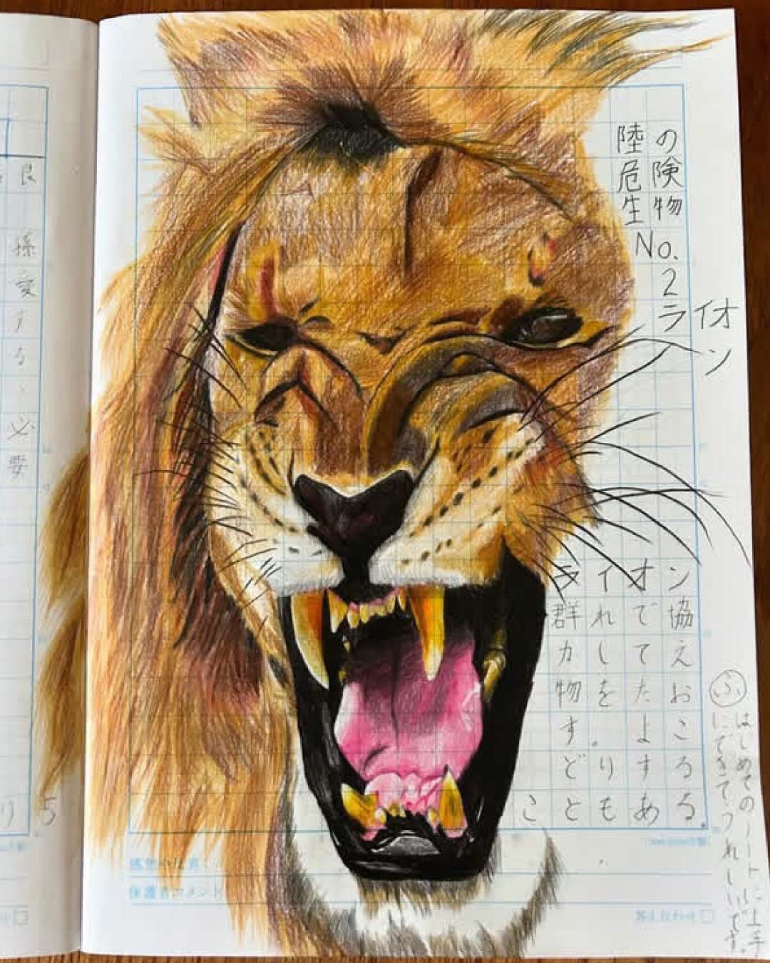「動物の毛並みや、口の中など、細かい部分までリアルに描くこと」(龍くん)。上手く描けているときは、鼻歌を口ずさみながら楽しそうに描いています。