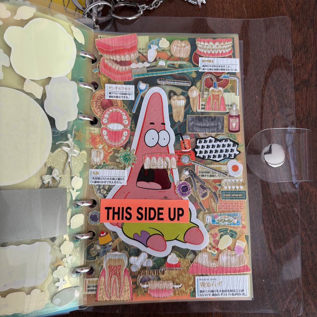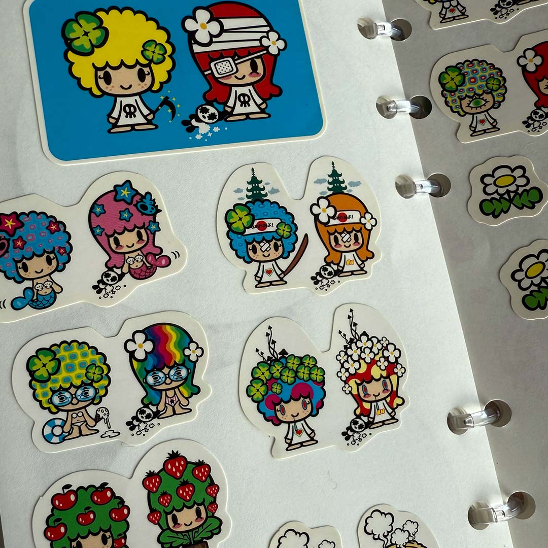 「ちょっとファニーなシールが大好きで、見つけるとつい購入してしまいます。最近はシールにハマりすぎて、自分のブランドでもつくりました(見開き写真右)。シール帳は、キャラクター、動物、変わったものに分けて3冊使っています。貼るときはキャラ別にしたり、色別にしたり、自分の好きなものしか貼らないページにしたり……感性を大切にシール帳を楽しんでいます♡ よく購入するショップは、100円ショップ、はちみせ、tsuki、RIRI MARKET、アンティークマーケットなど。癖のあるシールをいつも探しています」