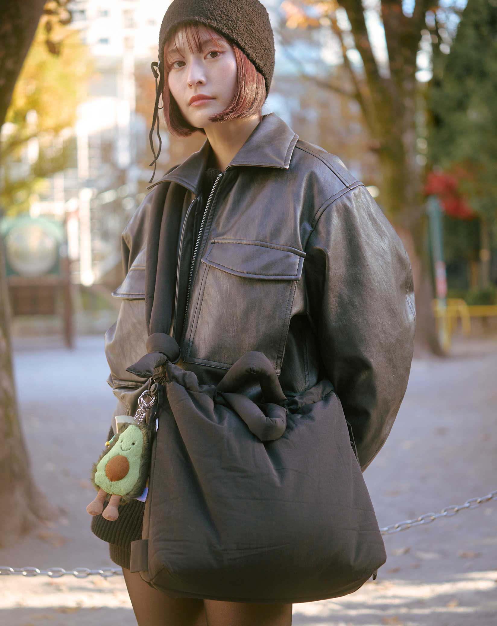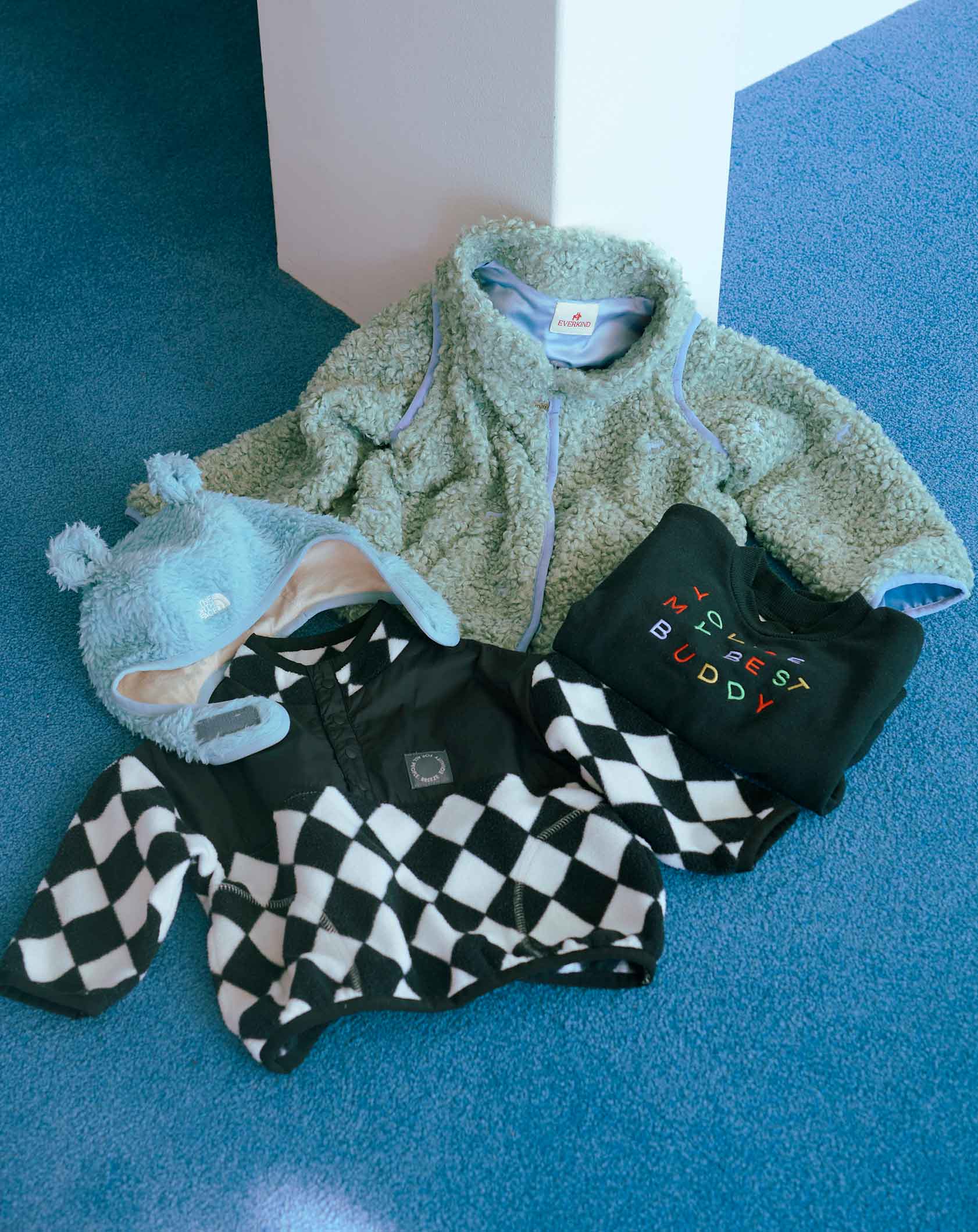 「(左上)『ザ・ノース・フェイス』の帽子は、街でつけているお子さんを見かけて思わずマネしちゃいました(笑)。(右上)ボアアウターは、友だちが手がけているブランド『エバーカインド』のもの。袖が取り外せてベストにもなる2wayタイプ。カラーリングも好き!(右下・左下)トレーナー&アウターは『ブリーズ』で購入。お手頃価格なのにデザインが可愛くて気に入っています」