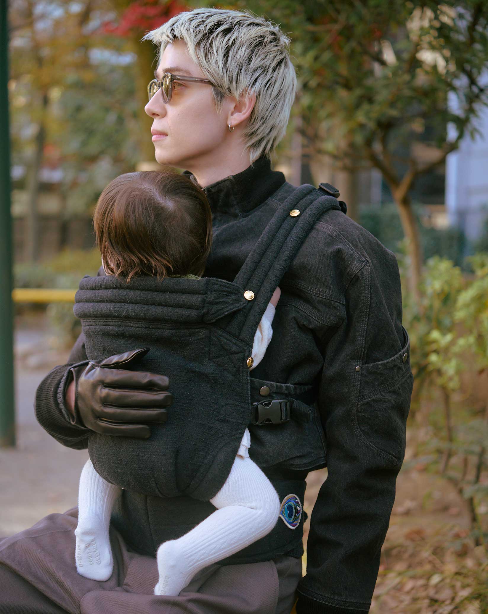 「『artipoppe(アーティポッペ)』の抱っこ紐は、デザインがミニマルで装着が簡単。コンパクトに畳むことができるので、お家のなかでもスペースをとらないのが◎。丸洗いができるのも気に入っています。カラーはふたりの洋服に合わせやすいようブラックをチョイス」
