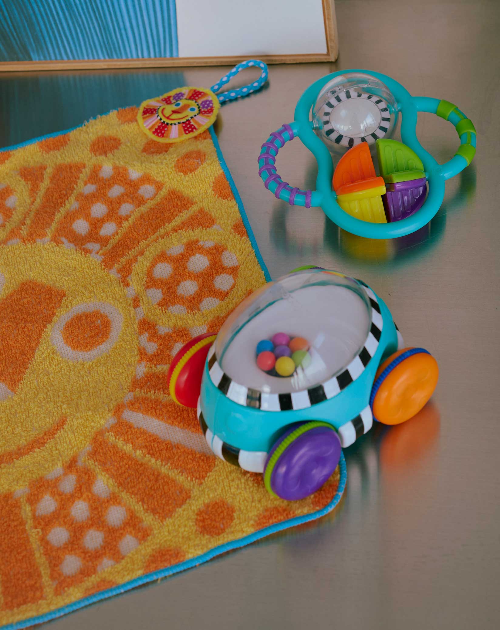 「オモチャとタオルはアメリカのブランド『サッシー』。キャッチーでポップな色使いは大人から見ても可愛いし、ベビさんの感性に響くといいなと思って。なかでもハンドスピナーがお気に入りみたいで、手で持っていなくてもエアーで動かしています(笑)。ベビさんは『サッシー』の歌動画が大好きで、歌うと泣き止んですぐご機嫌に♪」