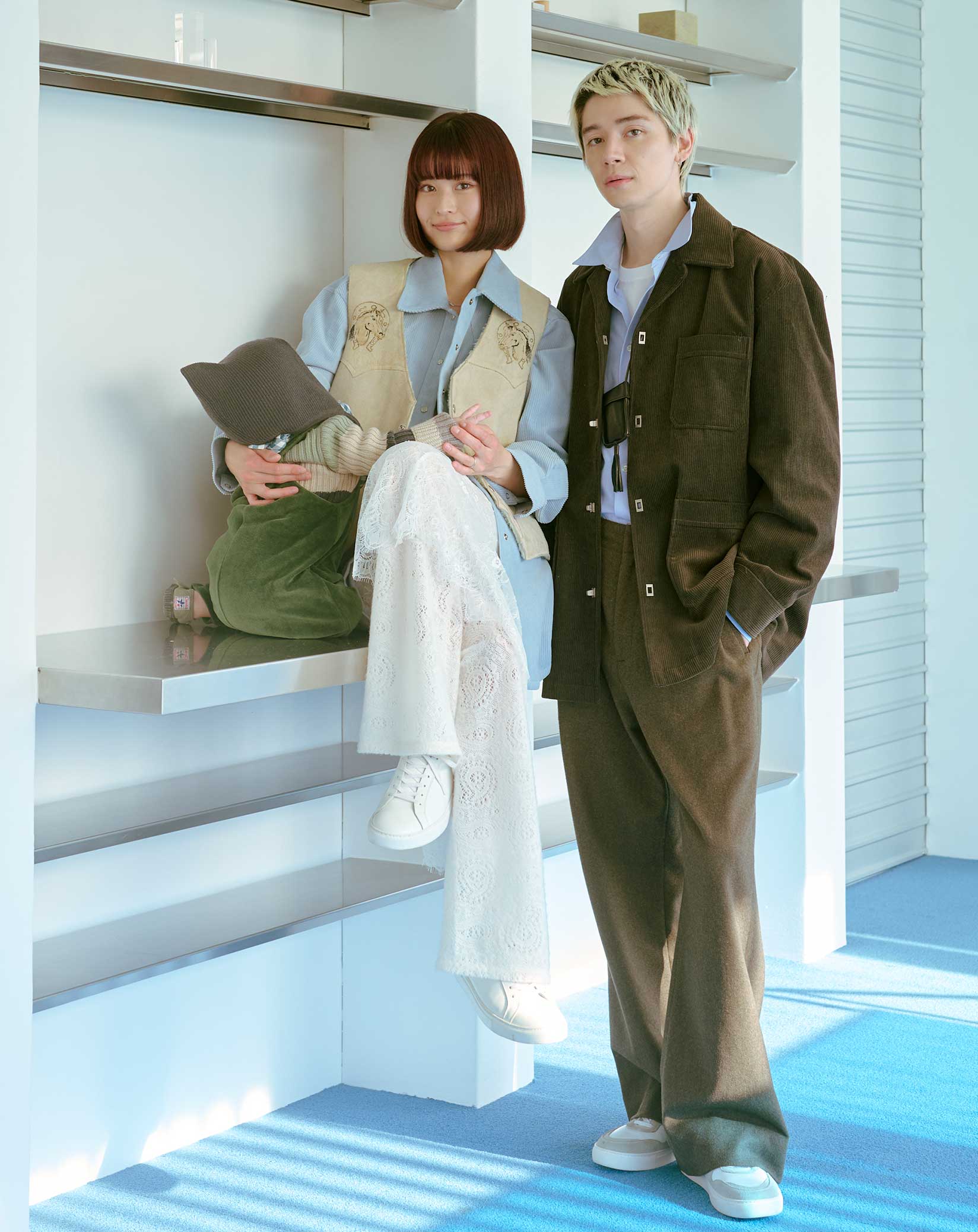 [Hikaru]ヴィンテージムートンベスト¥22,000/ベランダ 表参道、コーディロイシャツ¥18,360/GBH、レーススカート¥17,000、レースニットパンツ¥21,000/ともにクメ、ネックレス¥29,700/エスシル、ソックス¥2,860/ラングル(UTS PR)、スニーカー¥38,500/ヨーク(UTS PR)