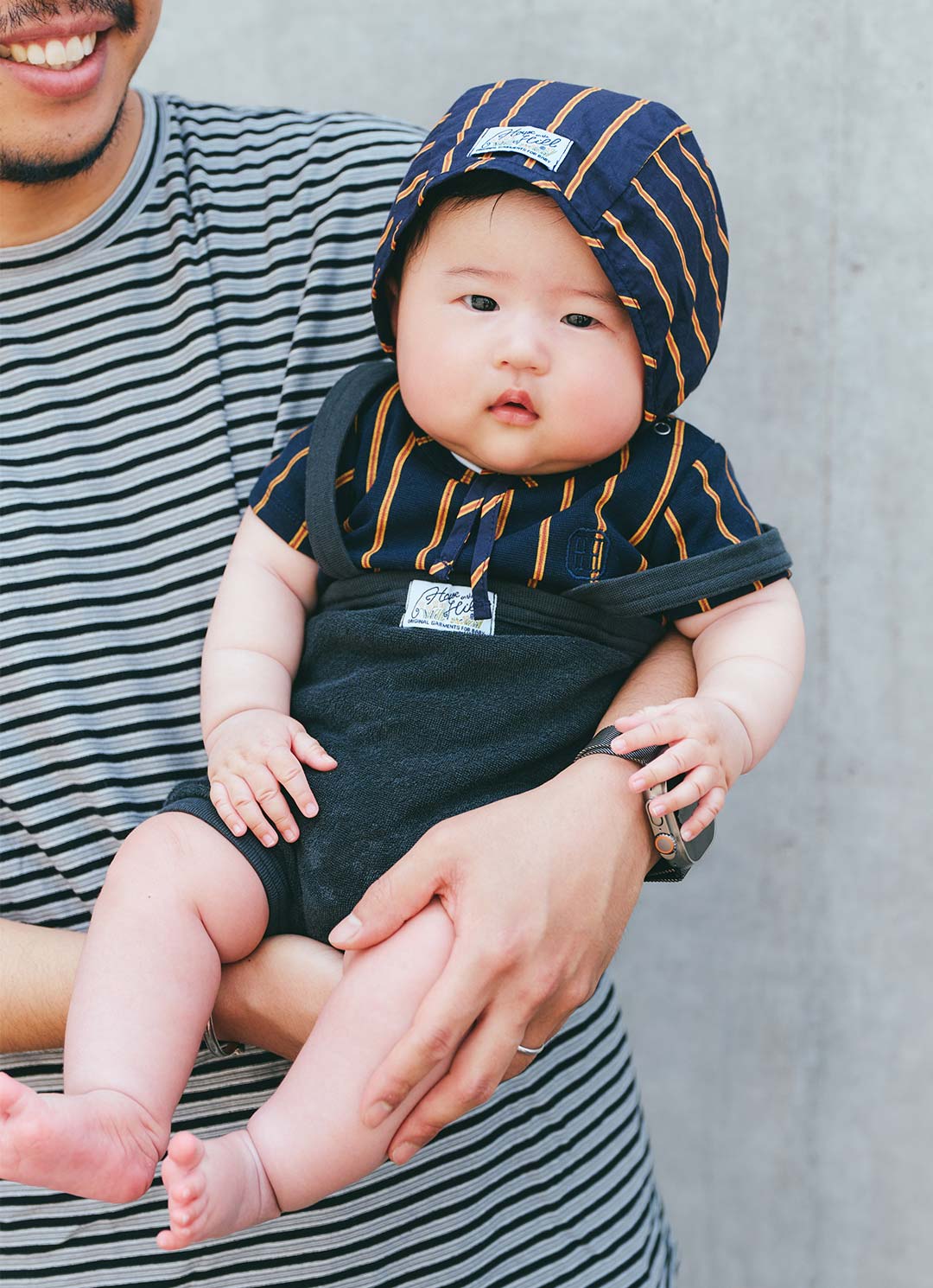 『ハウス オン ザ ヒル』でオールコーデを組んだキッズは、パパとお揃いのボーダー柄でリンク。パイル地のロンパースが今の季節にぴったり♪