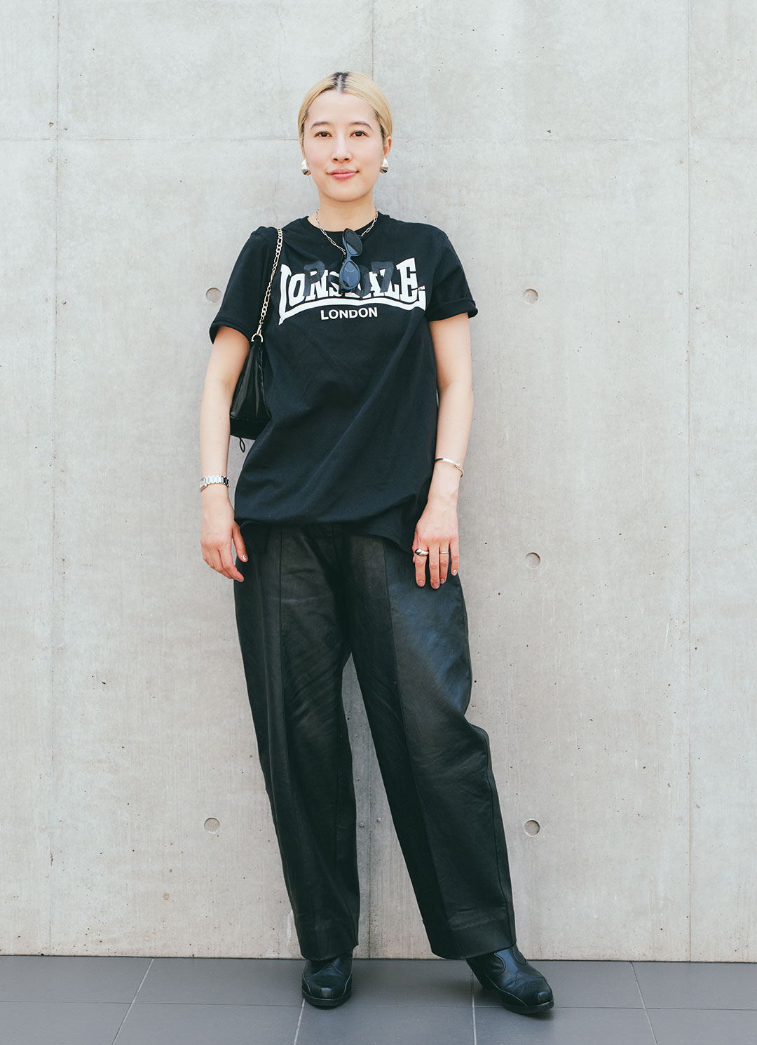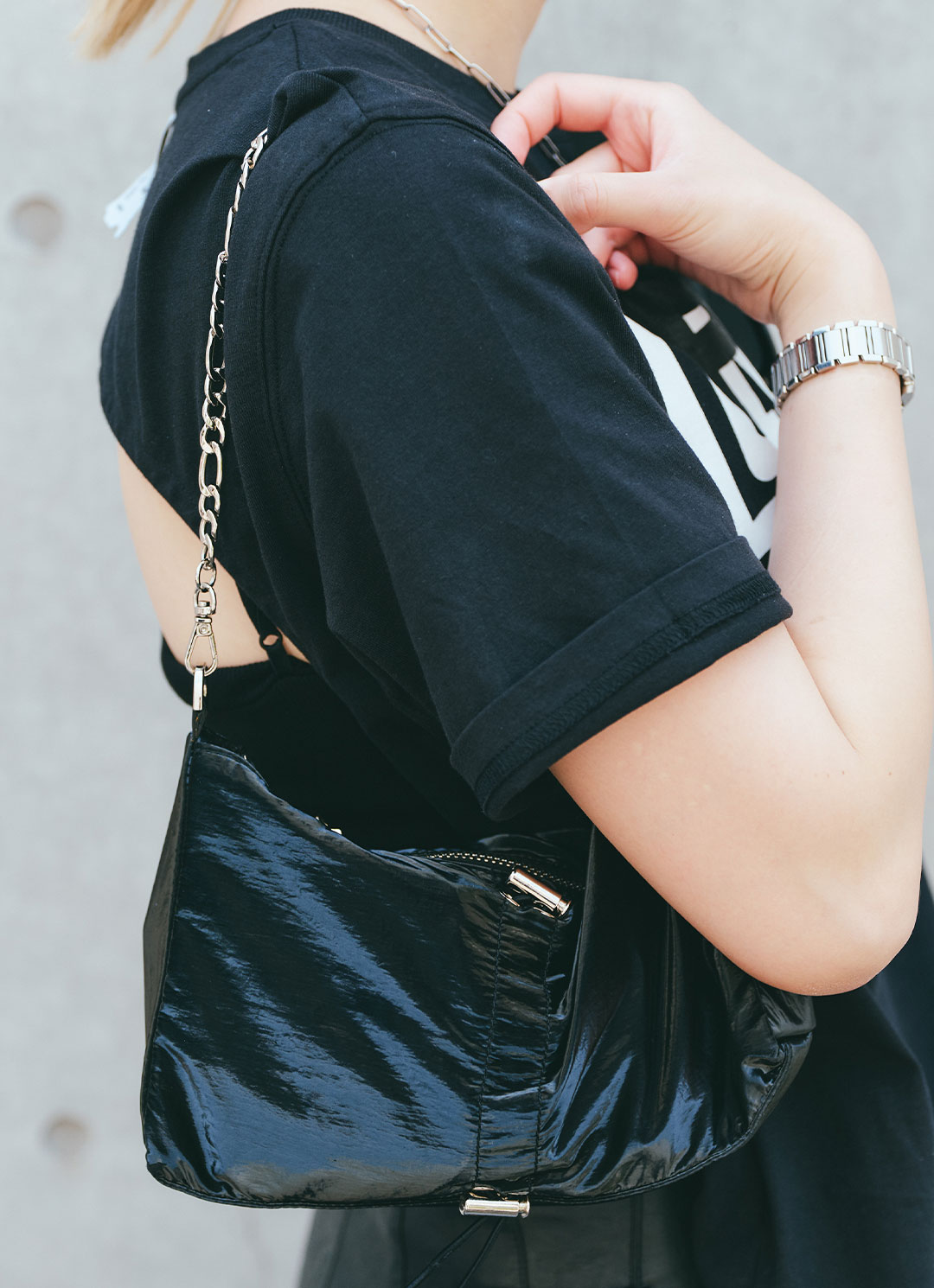 『イー イー』のエナメルバッグでブラックコーデが立体的に。チェーンストラップとツヤ感のある素材が、シンプルな装いにリッチテイストを効かせてくれる。