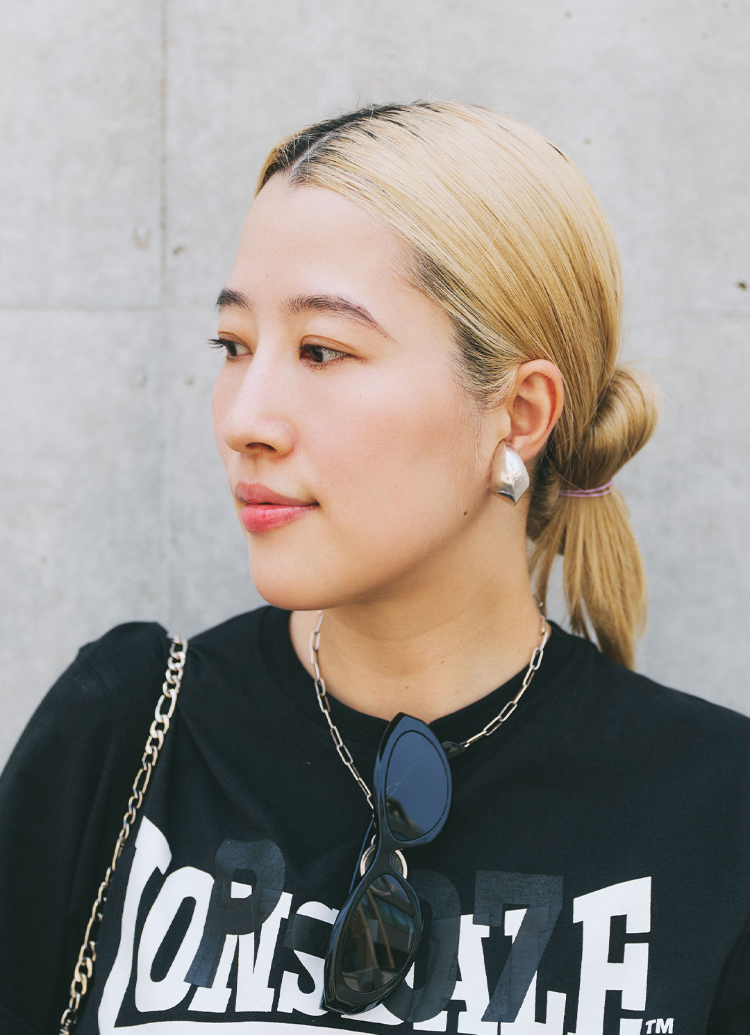 ハイトーンヘアがコーデの挿し色役に大活躍。シルバーアクセサリーとサングラスでスパイスを加えて、辛口な夏モードをエンジョイ!
