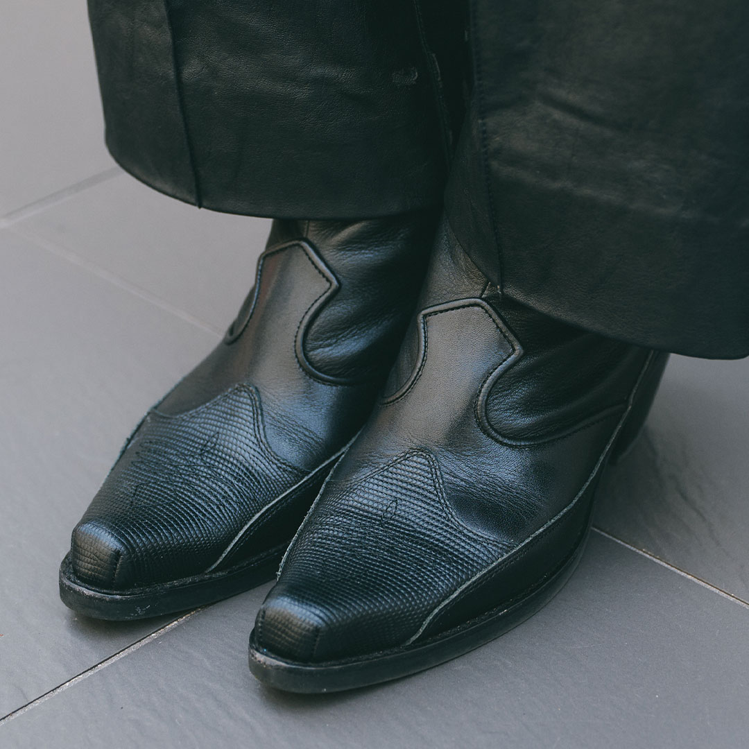 ママの足元を飾るのは『フミエ タナカ』の重厚感あるブーツ。艶やかなレザーとリザード調の異素材MIXが目を引くデザイン。
