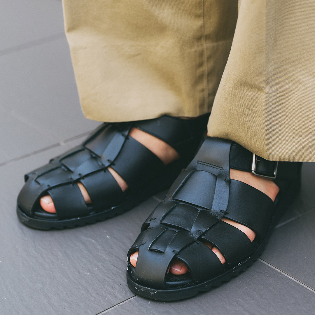 編み込みデザインのサンダルがなんとも涼しげ! ベージュのワイドパンツと合わせてこなれ感を演出。