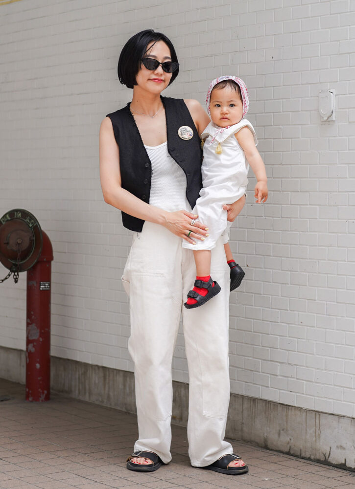 重くなりがちなブラックも、柄で挿して夏小物を投入すれば、たちまち季節感あるシックスタイルにチェンジ! 足元はレザー素材で上品さをプラスしつつ、パパとベビーの柄リンクで統一感も忘れずに、まとまりある家族コーデの完成!