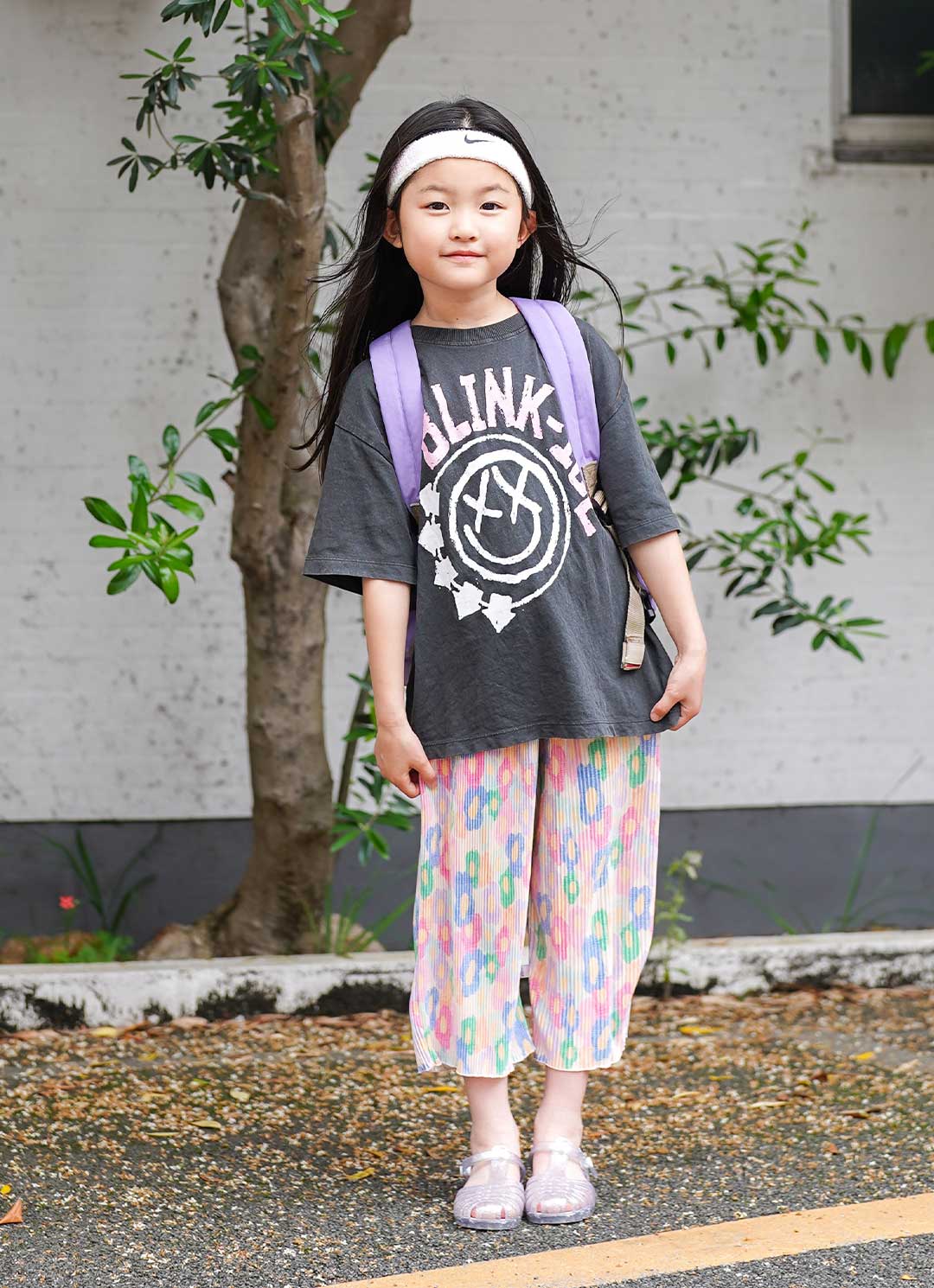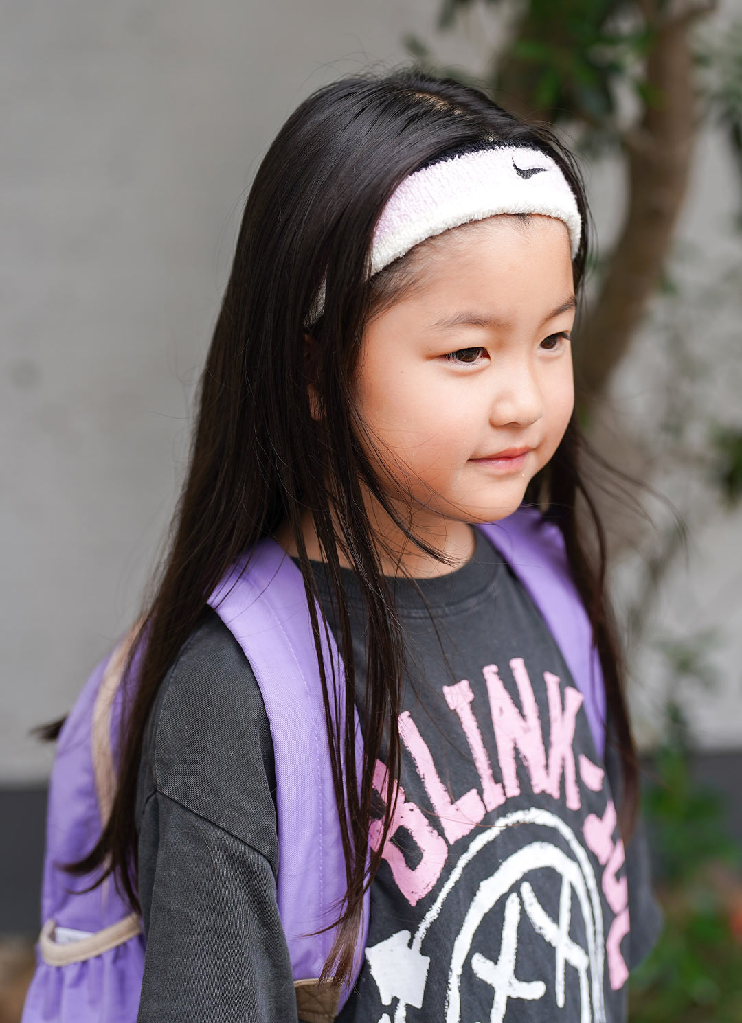 ピンクのロゴが印象的な辛口Tシャツが主役に抜擢! 白いヘアバンドがアクセントになり、スポーティながらも女の子らしい雰囲気を演出。