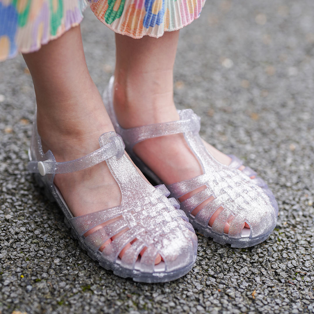 キラキラなサンダルに、キッズのテンションもアップ♪ クリア素材が涼しげで、カラフルな花柄パンツとの組み合わせも◎。