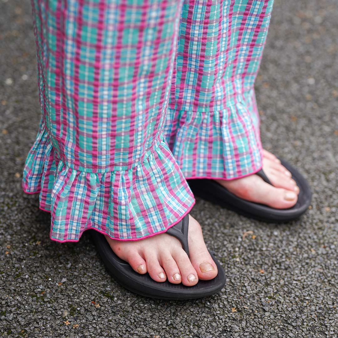 足元はプチプラ『ダイソー』の黒のサンダルを投入。スポーティにバランスを取りつつ、裾のフリルが歩くたびに揺れる夏の軽やかさを演出してくれる。
