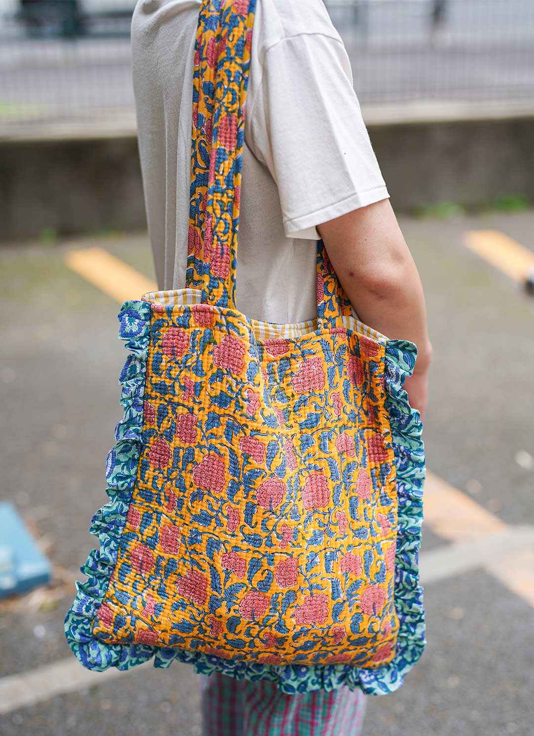 ポップな色使いの花柄バッグに視線集中! 日用品をアップサイクルしたというストーリーも興味深いアイテム。