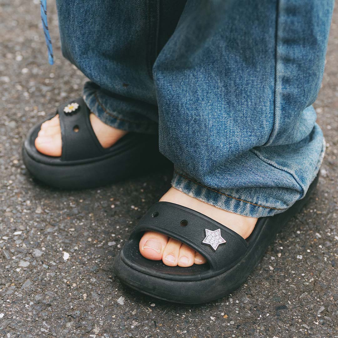 足元は『クロックス』のプラットフォームサンダルでボリューミーに。チャームアレンジはワンポイントに絞って、コーデを引き立てのがポイント。