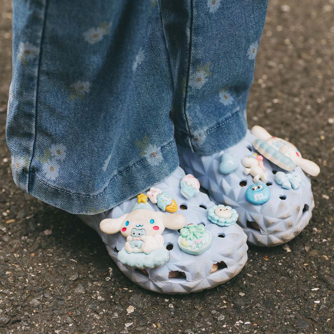 サンダルとチャームをライトブルーで統一して、好きなものを詰め込んだアレンジセンスはお見事! 花柄デニムとの組み合わせて、遊び心たっぷりな足元に。