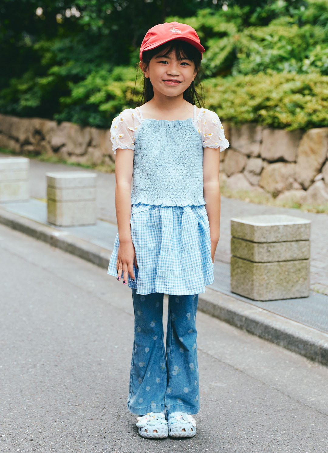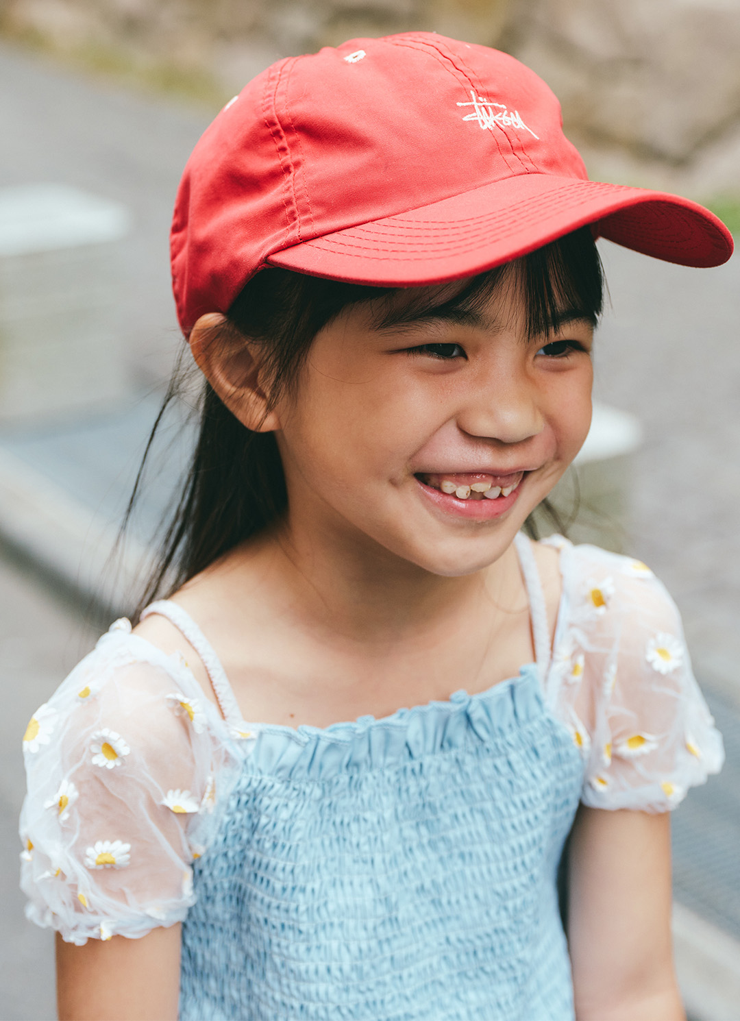 『ステューシー』の赤キャップが親子コーデ差し色に大活躍! ガーリーな装いにスポーティテイストを加えて、甘辛MIXに昇華。