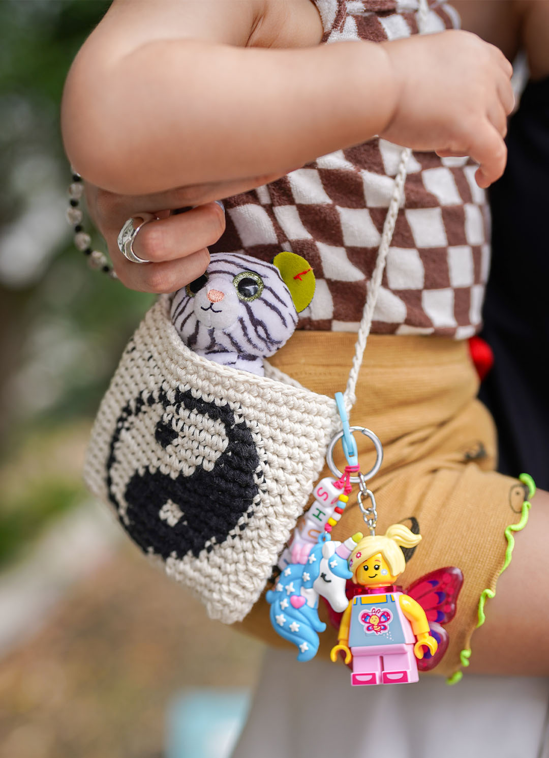 インヤン柄のニットバッグは、ボトムスとモチーフをシェア! キュートなバッグチャームたちとぬいぐるみを連れて、お出かけしよう♪