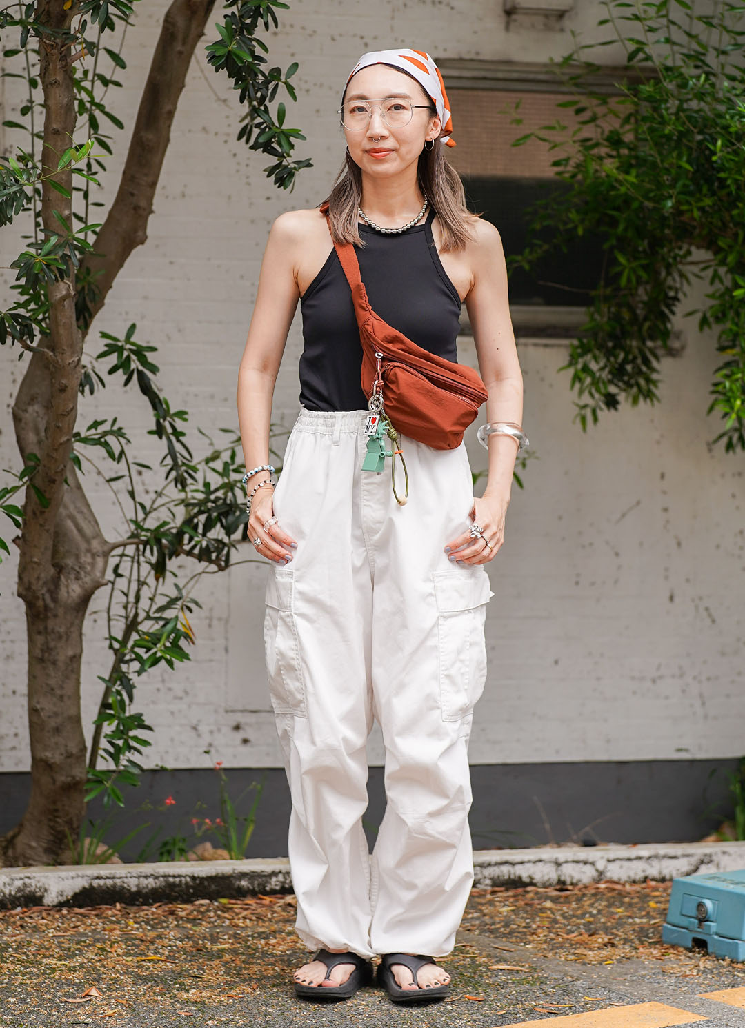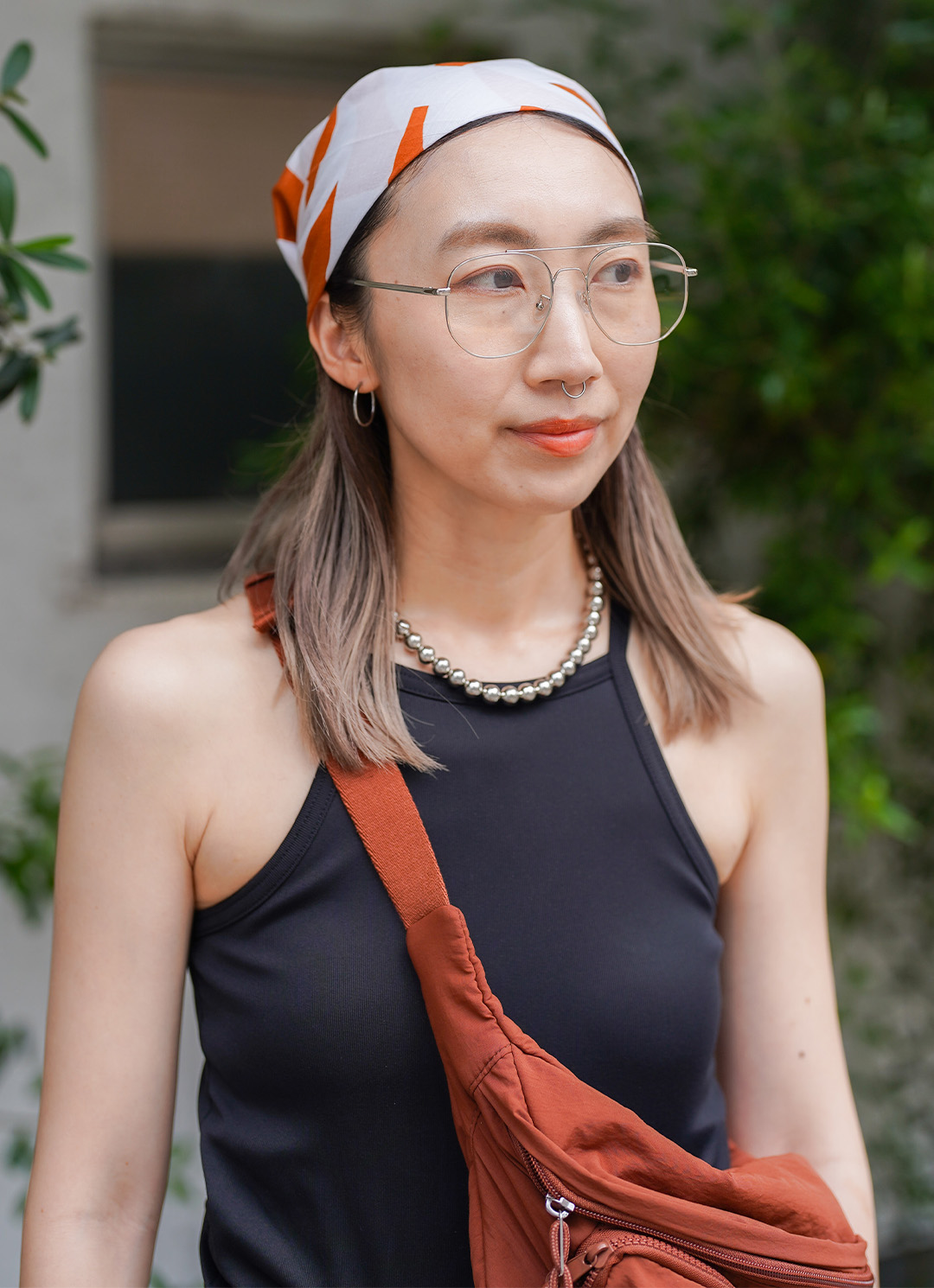 オレンジ×ホワイトのバンダナは主役級の存在感。クラシカルなメガネとパールネックレスで、繊細さを加えたバランス感はお見事!