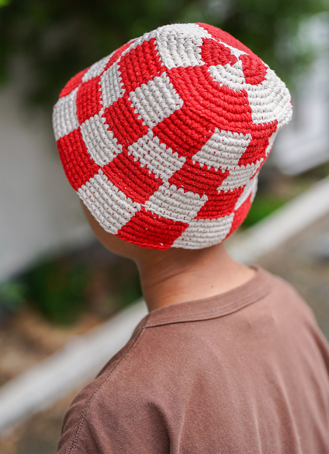 レッド×ホワイトの編み込みハットで、フェスコーデのワクワク感を演出! ストリートコーデを一気に盛り上げてくれるアイテム。