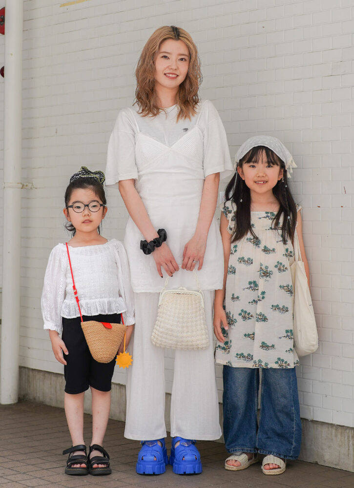 チュールやフリルを使ったガーリースタイルをメインに、小物でほんのりスパイスを足した甘辛のバランス感が絶妙! 爽やかなホワイトをシェアして、それぞれヴィヴィットカラーを挿した親子コーデは暑い夏もハッピーに過ごせるスタイルに♪