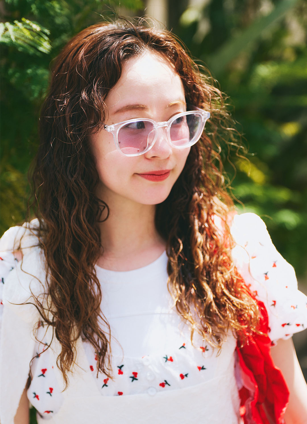 クリアサングラスは肌馴染みの良いピンクレンズをセレクト。カーリーヘアとレッドリップでハッピームード漂う顔周りに♪