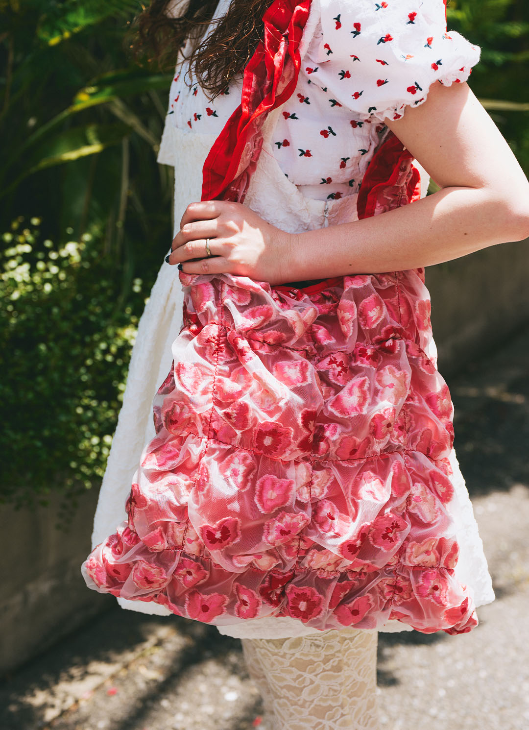 フラワーモチーフにフリルのショルダーとロマンティックなバッグをコーデの主役に抜擢 ! たくさん入る容量なのもママには助かるアイテム。