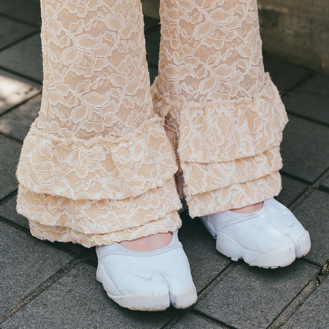 『ナイキ』のエアリフトを投入して、スポーティテイストをオン! ガーリーなボトムスと合わせて甘辛く仕上げたのがグッド。