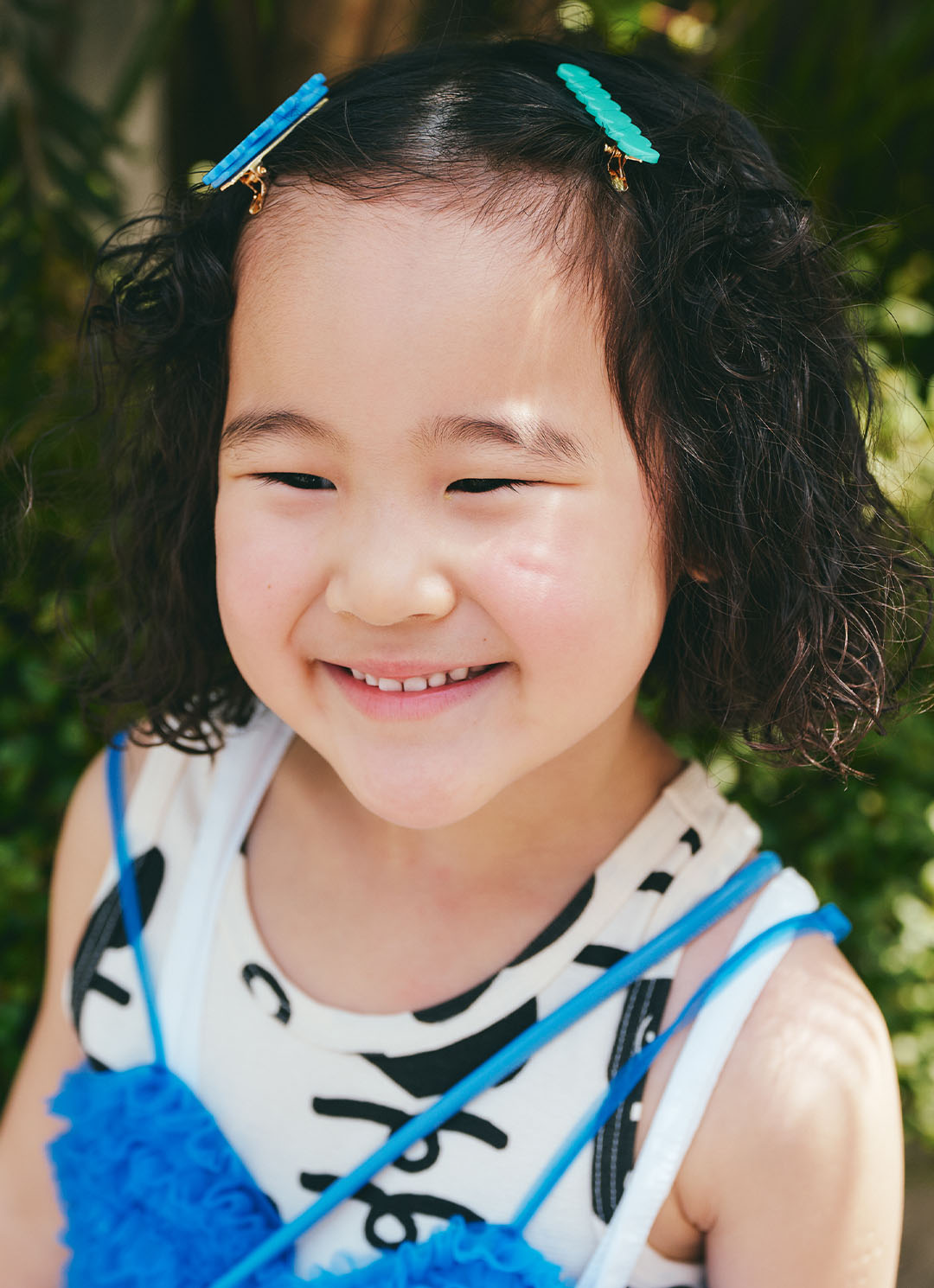 キュートなカーリーヘアはママと仲良しリンク! ターコイズブルーのヘアピンを添えて、とことんカラーコーデを楽しんで♪