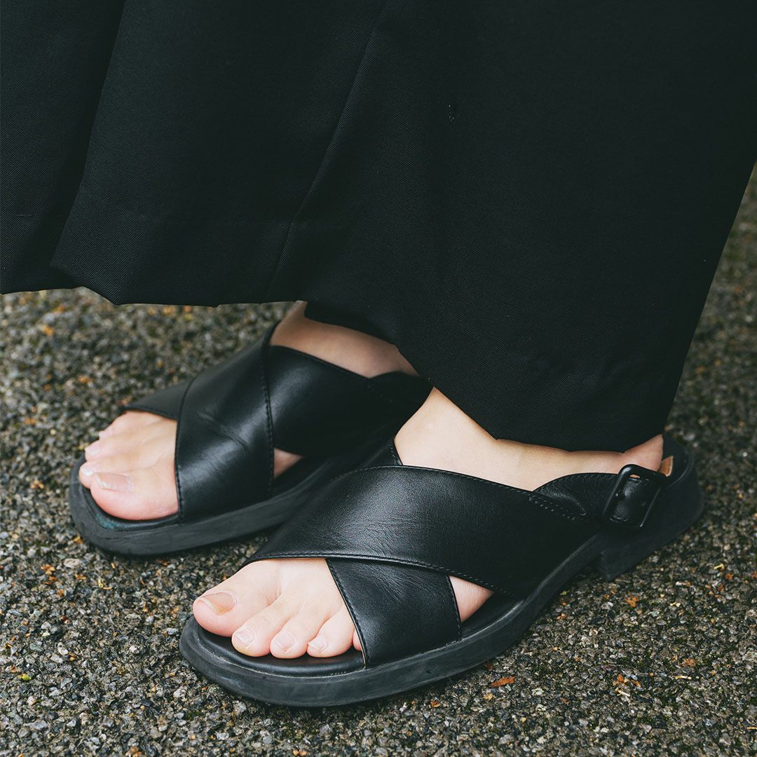 黒のレザーサンダルと落ち感のあるワイドボトムスで上品にまとめ。『カンペール』ならではの歩きやすさも確保した大人のリラックススタイル。