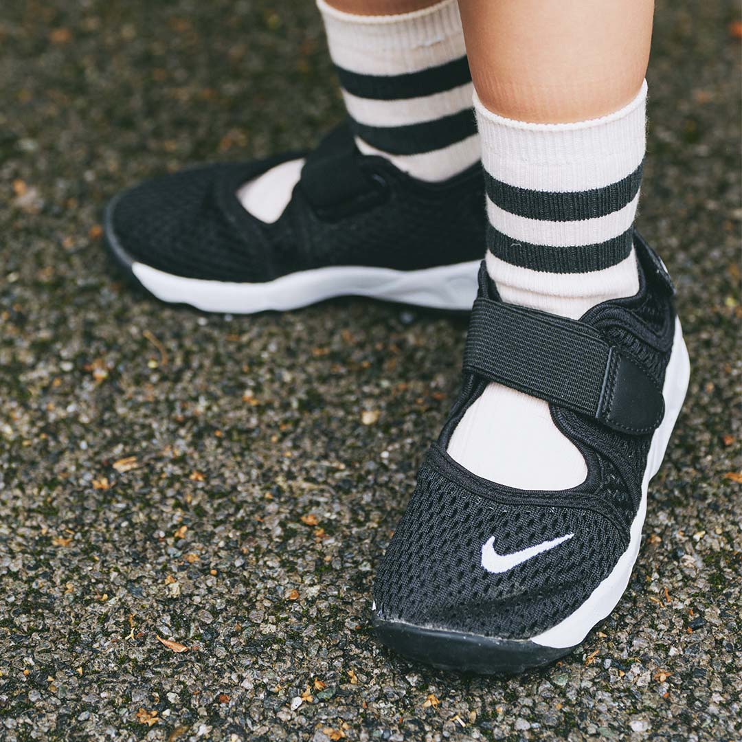 メッシュ素材のスニーカーに、ボーダーソックスを合わせて動きやすい足元に。モノトーンに決めて、コーデを引き締めたのがグッド!