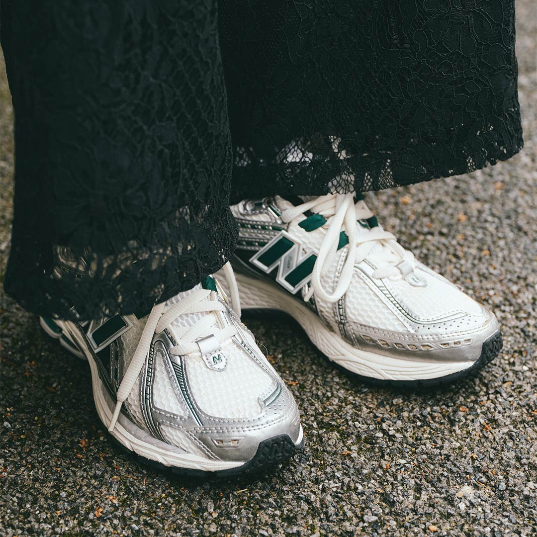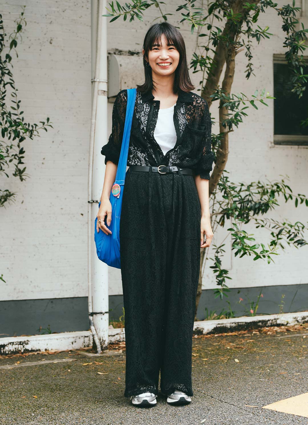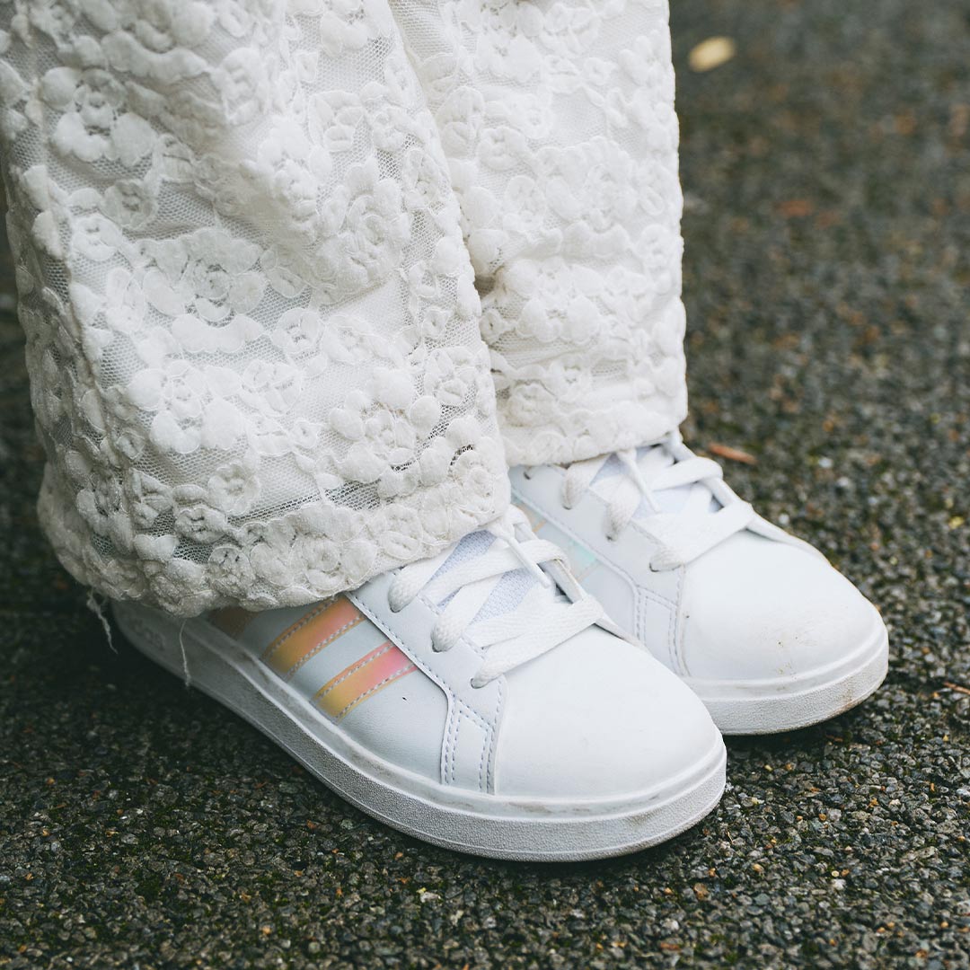 シルバーラインがきらめくスニーカーで軽やな装いに昇華! 甘いレースのオールインワンに対し、足元はクールに決めてバランスを取ったのがグッド。