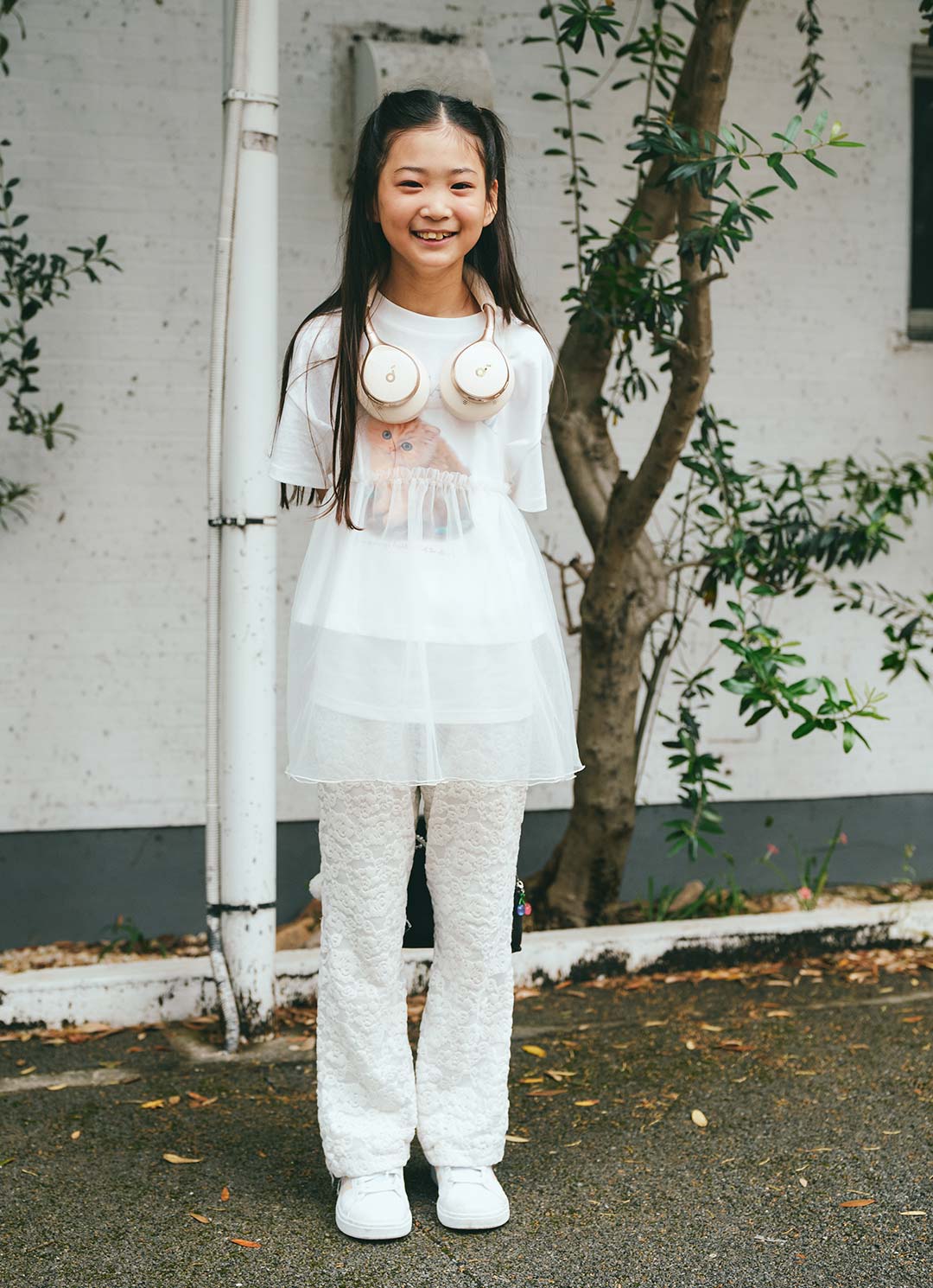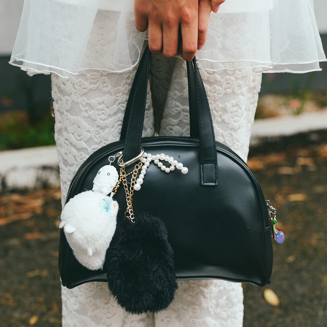 黒のミニバッグにお気に入りのチャームを付けてをデコレーション。遊び心のある、キッズらしいキュートさをプラス。