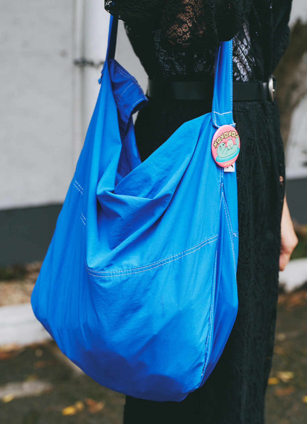 冴えるブルーのショルダーバッグが挿し色にぴったり! 『東名厚木健康センター』で購入したユニークな缶バッヂは、思わずメロメロになってしまいそう。