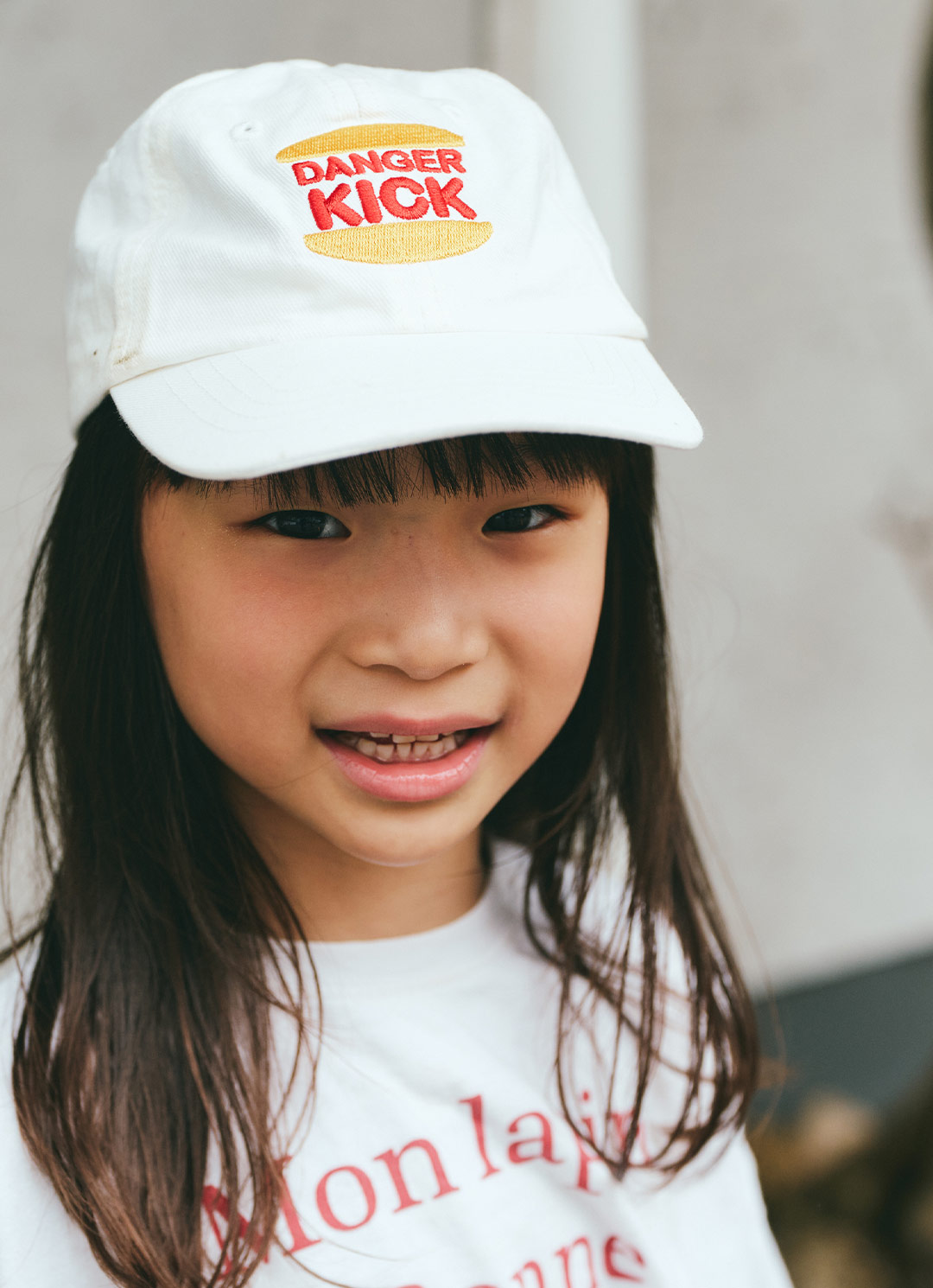 ポップなモチーフが目を引くキャップをオン! Tシャツから赤を拾って統一感を出したのがポイント。