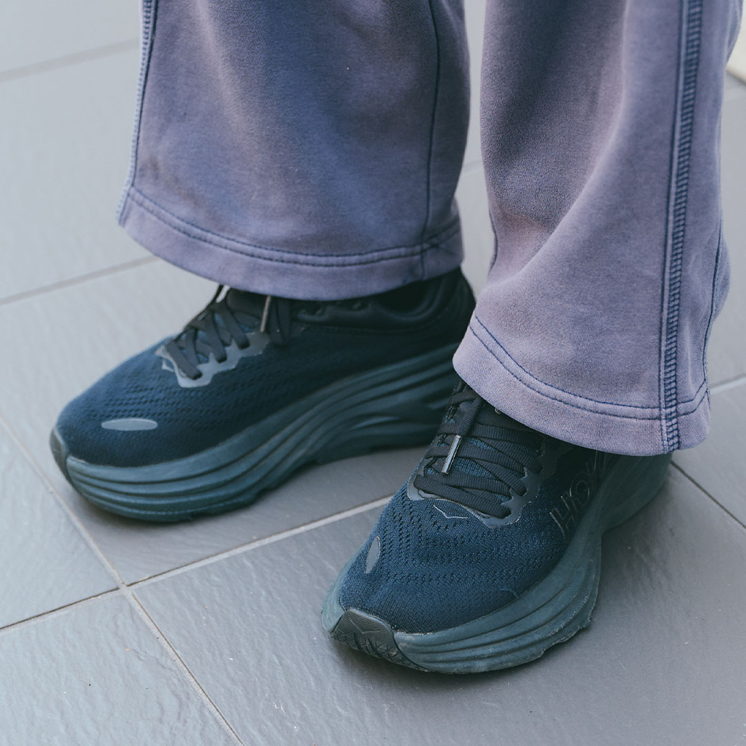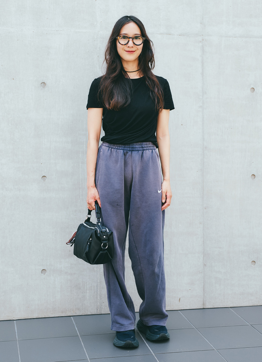 ラフなボトムスに厚底スニーカーをオン。 黒をチョイスして、カジュアルすぎないよう引き締めたのがグッド!