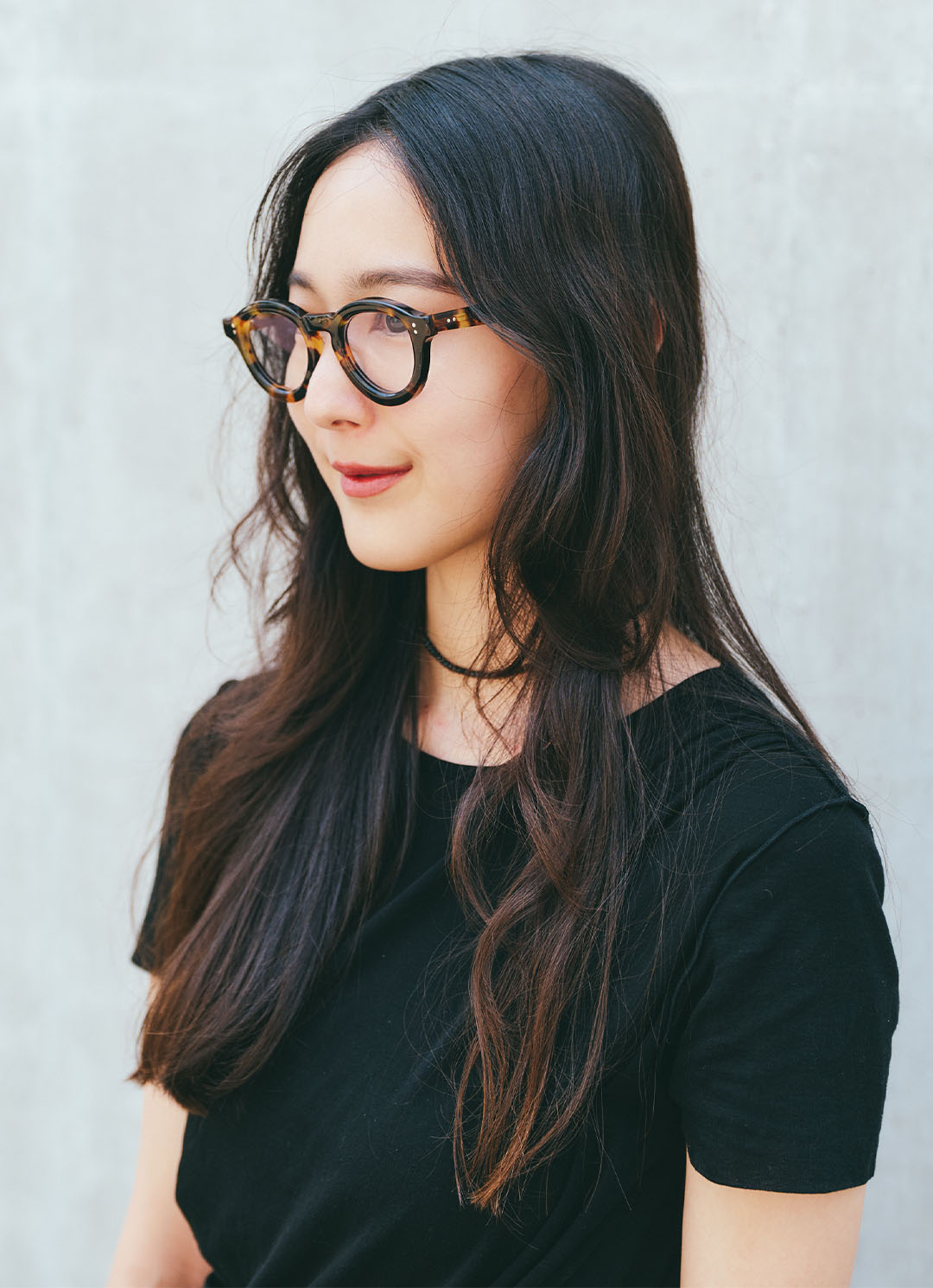 『スニークピーク』のべっ甲柄メガネが、シンプルなブラックコーデのスパイスに。チョーカーでトレンド感もプラスして、夏のモードスタイルが完成。