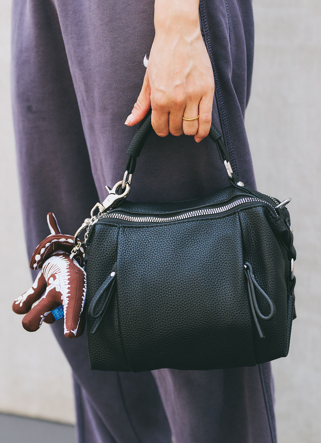 正統派なレザーのバッグに恐竜チャームをくっつけて。大人っぽいアイテムに遊び心を加えた、コントラストが新鮮!