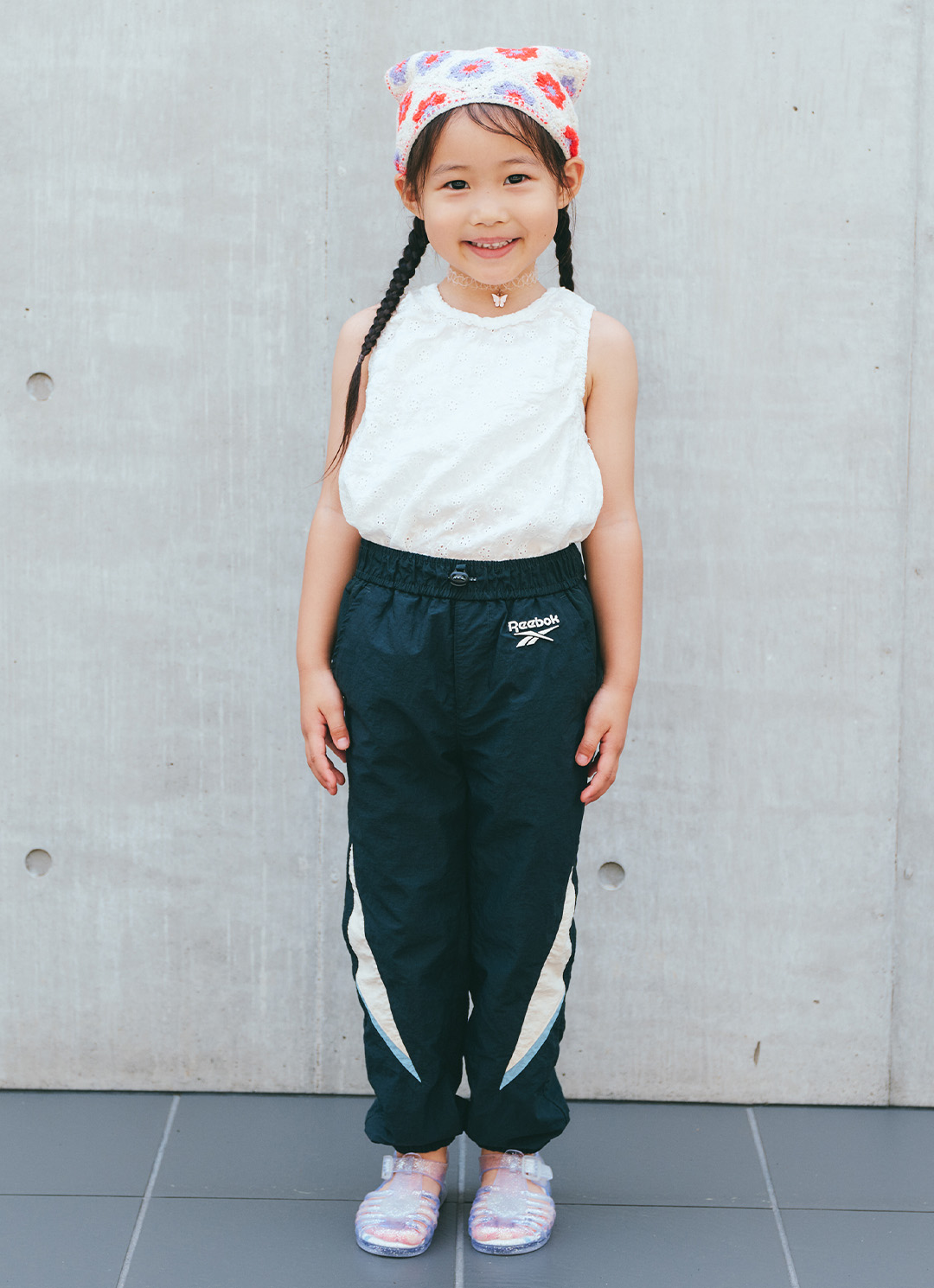 3. クロシェット編みのバンダナに視線集中。スポーティMIXで親子リンク