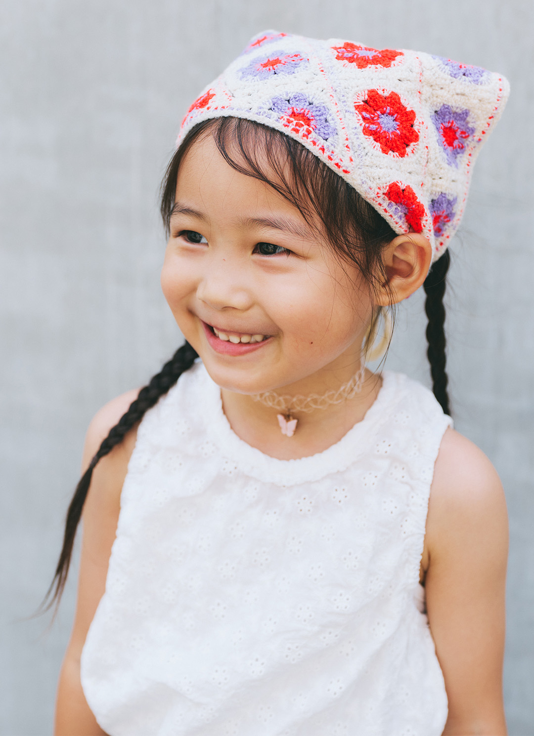 クロシェット編みのバンダナに視線集中。スポーティMIXで親子リンク