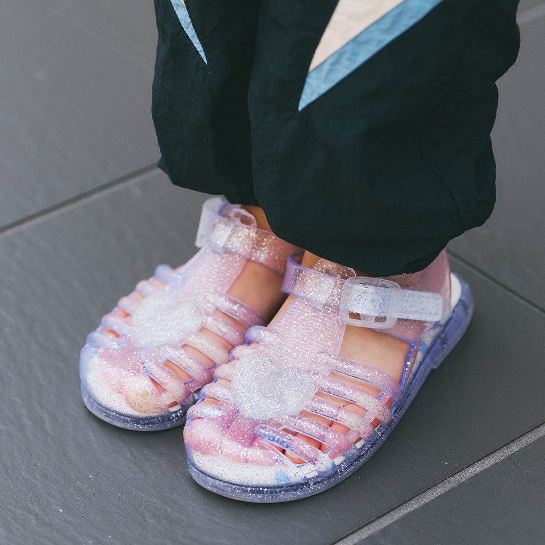 スポーティーなパンツに対して、キラキラのサンダルで甘辛MIXな着こなしに昇華!