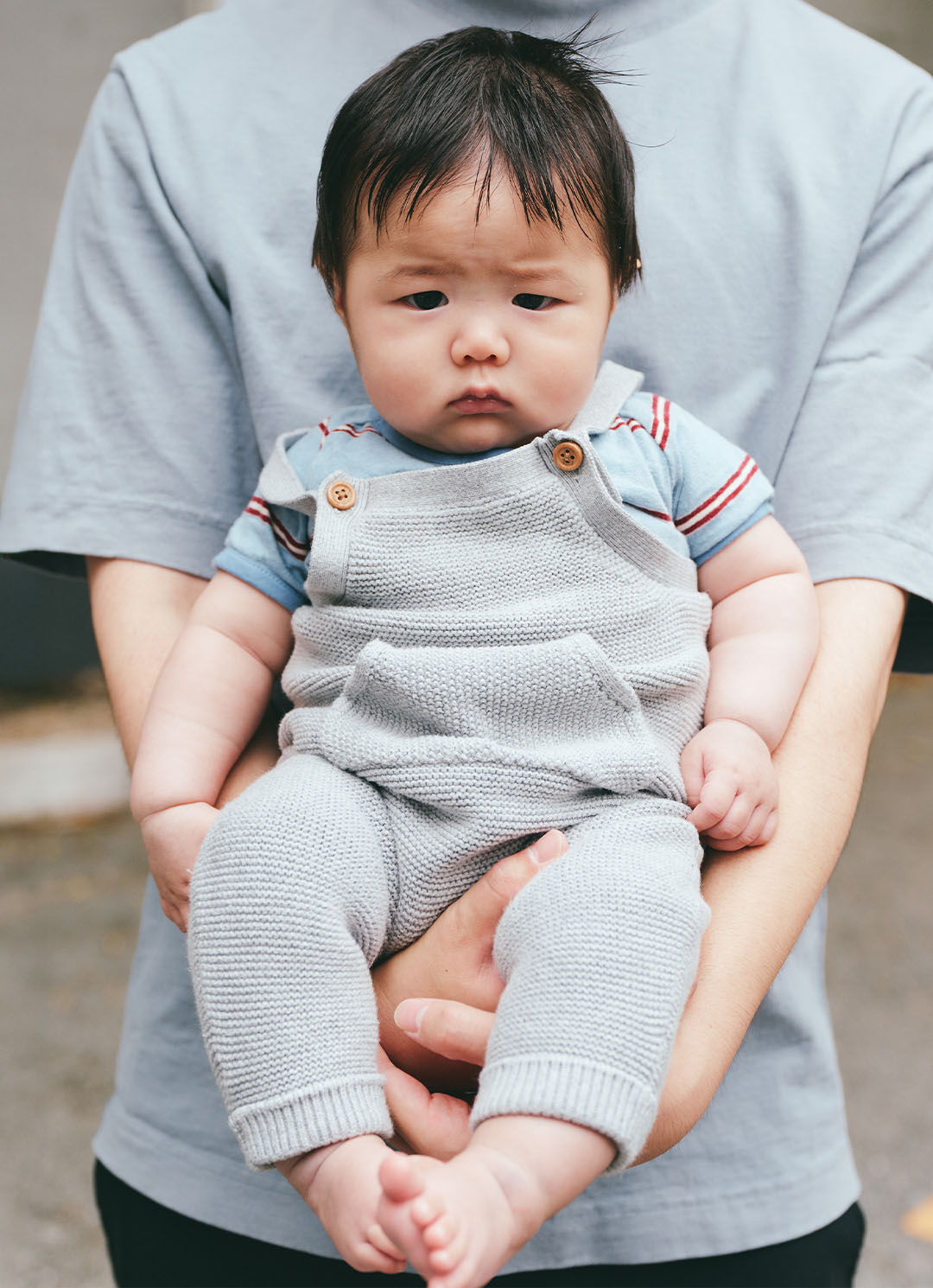優しい生地感のサロペットはアメリカのお土産のもの。インナーはお兄ちゃんとボーダーをシェアして兄弟リンクをエンジョイ♪
