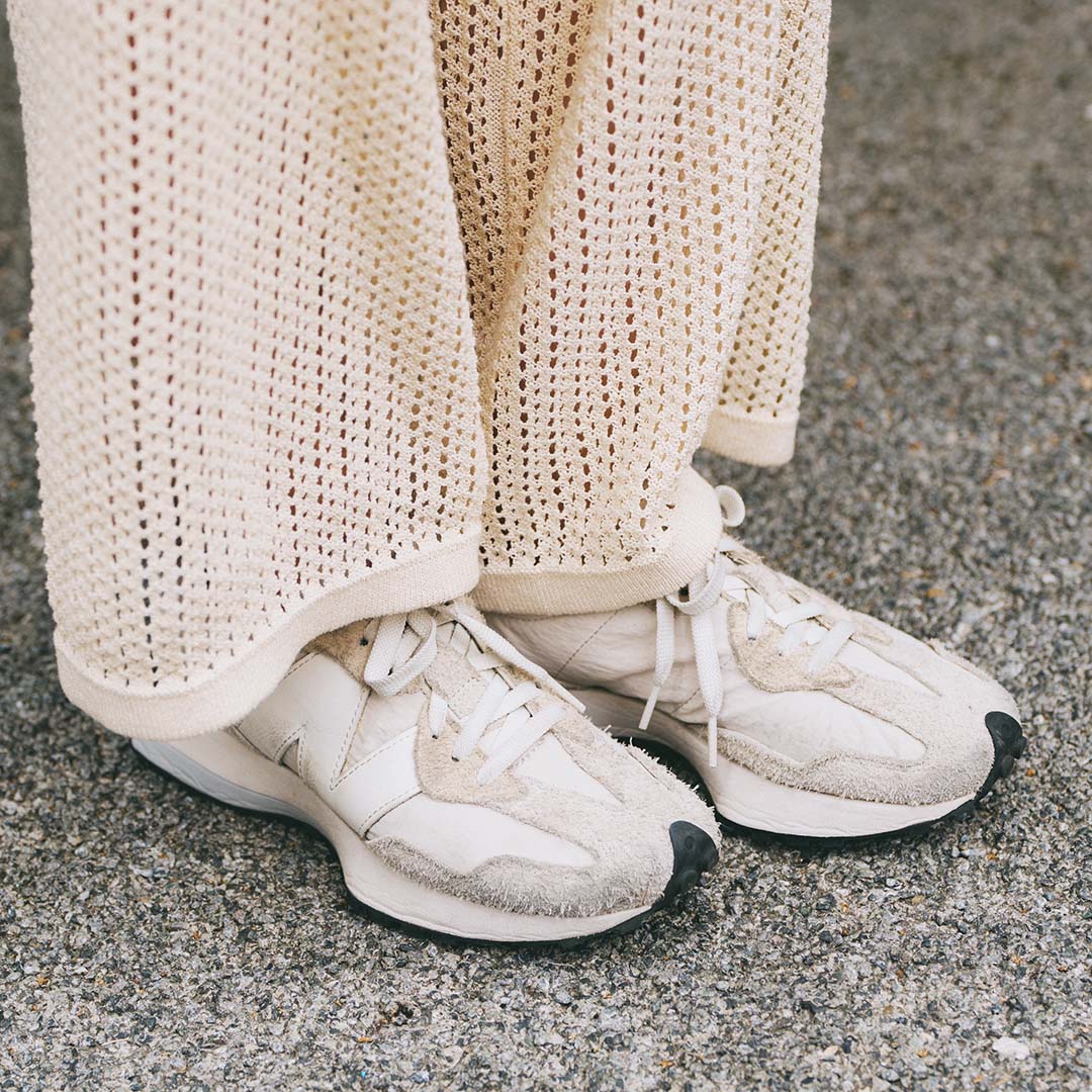透け感のあるニット素材のボトムスでメリハリをプラス。ベージュトーンでまとめた足元は、『ニューバランス』のスニーカーで程よくスポーティに。