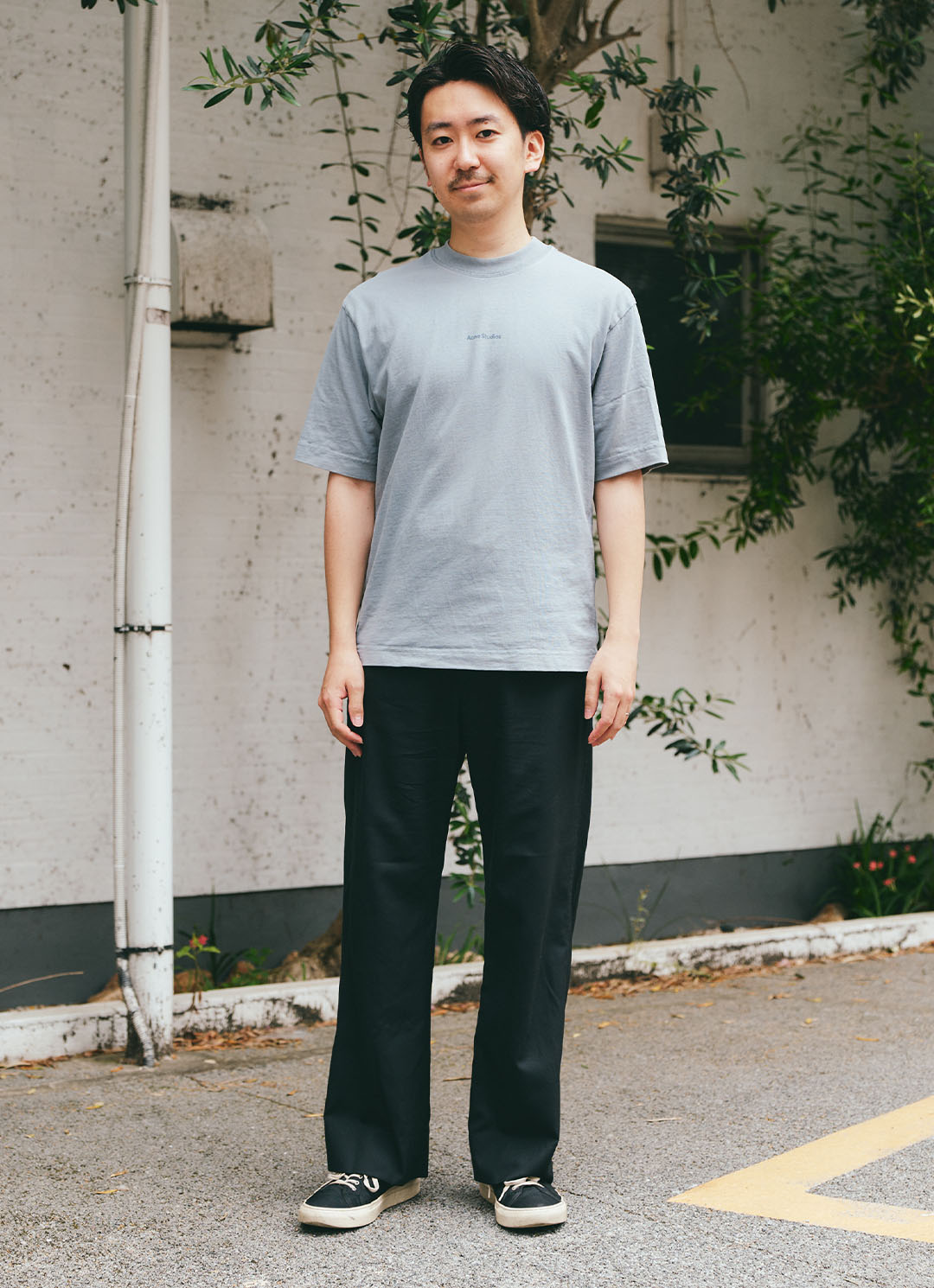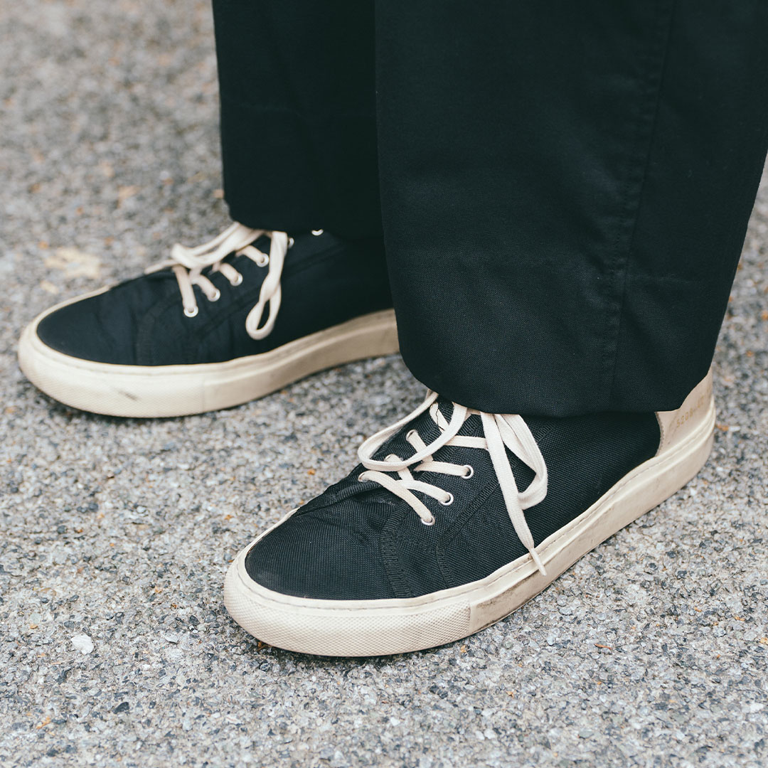 ダークトーンのボトムスに、『コモン プロジェクツ』のスニーカーをオン。ホワイトのソールが装いをさりげなく引き締めてくれる。