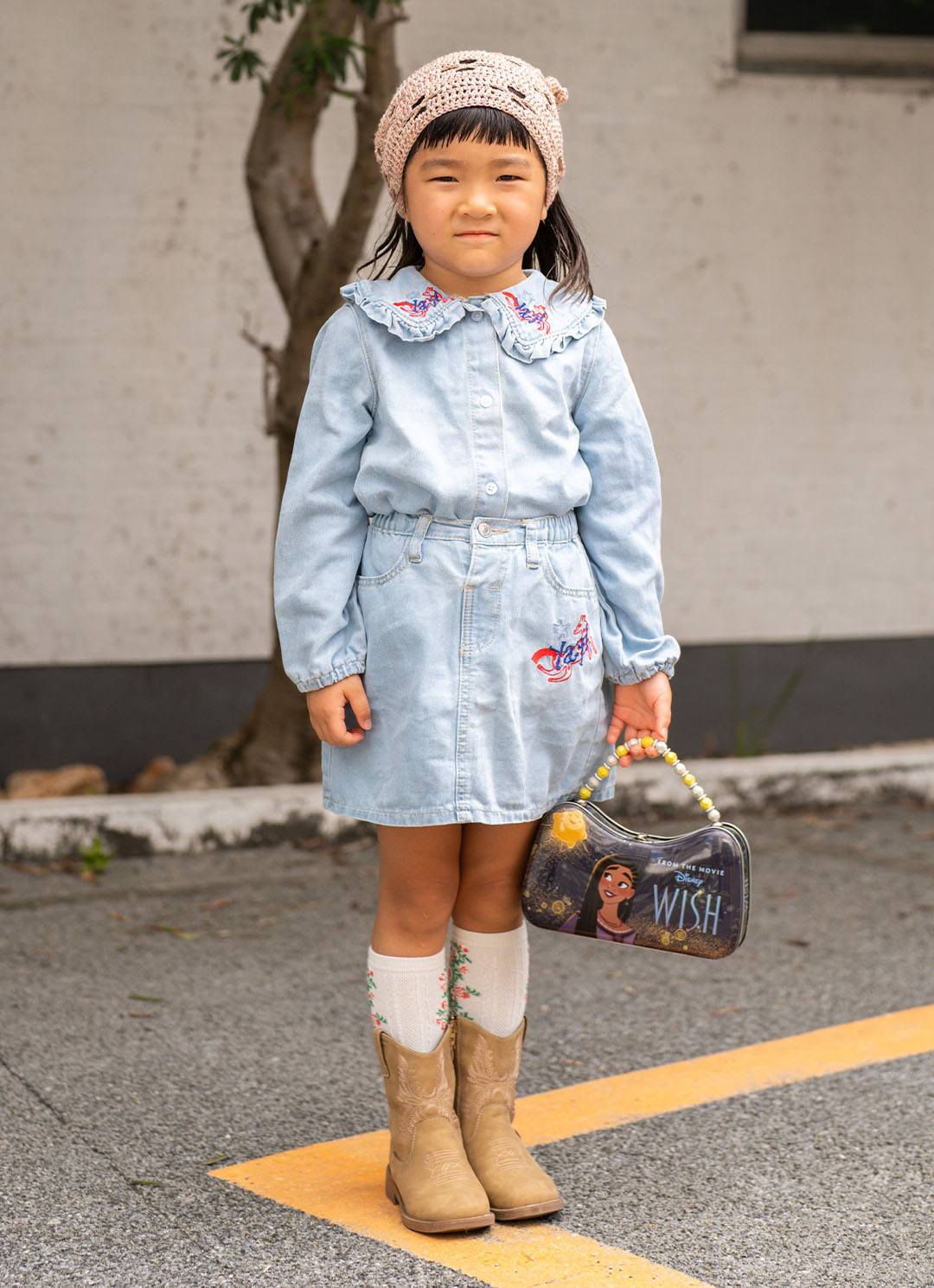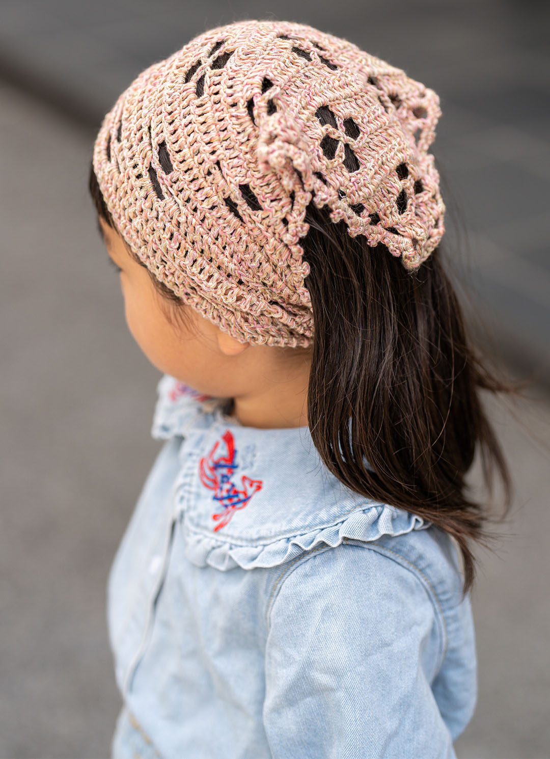 バブーシュカはハンドメイドならではのあたたかさのあるアイテム。デニムのセットアップスタイルを華やかに彩ってくれる。