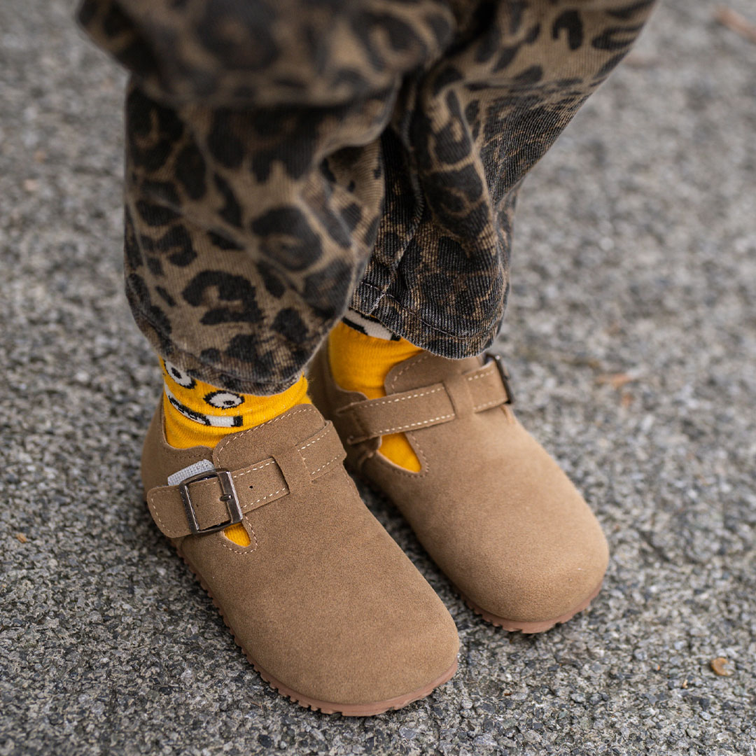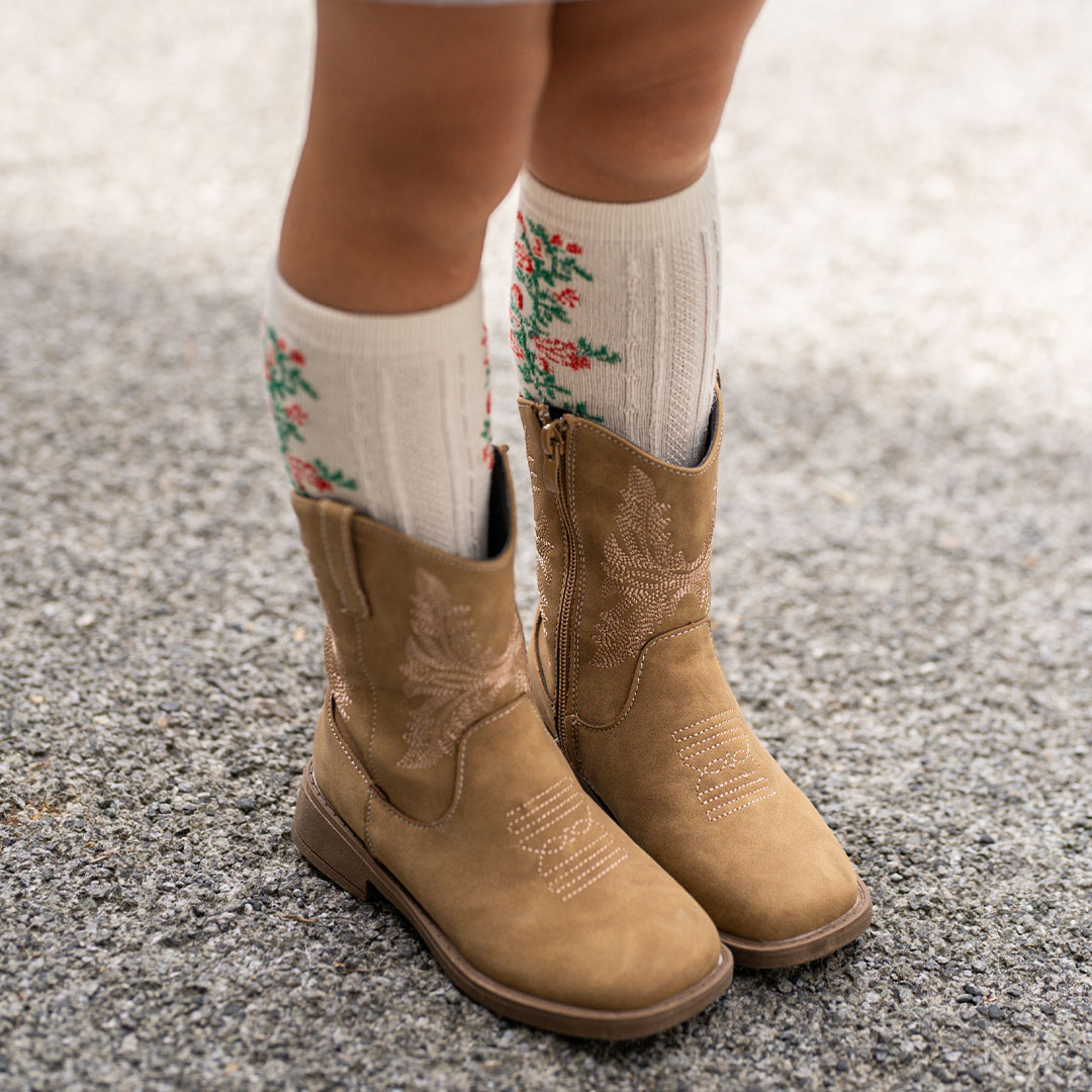 ママとアイテムリンクしたブーツは、スウェード素材で季節感アップ! 花柄のソックスを見せて、バランス感ある着こなしに。