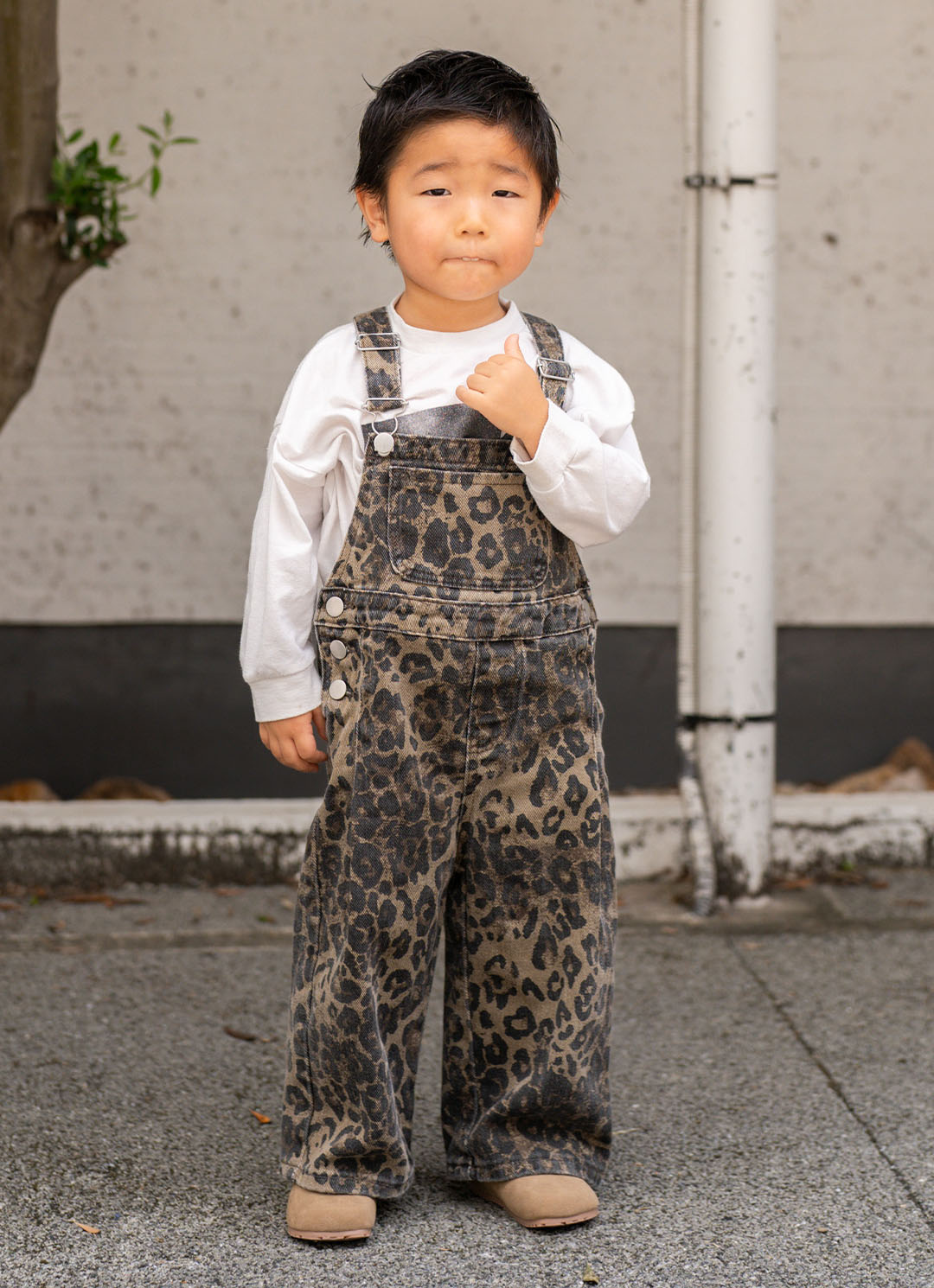 レオパード柄のボトムスとベージュのシューズで、今っぽいゆるシルエットを実現。マスタードイエローのソックスが辛口な挿し色役に大活躍!